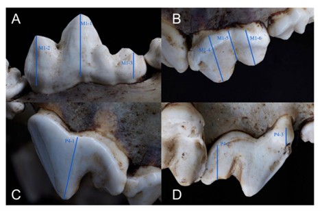 Crown height measurements for each of M1, P4, and M1. A (lingual view of M1) shows measurements M1-1, M1-2, and M1-3. B (buccal view of M1) shows measurements M1-4, M1-5, and M1-6. C (buccal view of P4) shows measurement P4-1. D (lingual view of P4) shows measurements P4-2 and P4-3. Source: Megan Bieraugle.