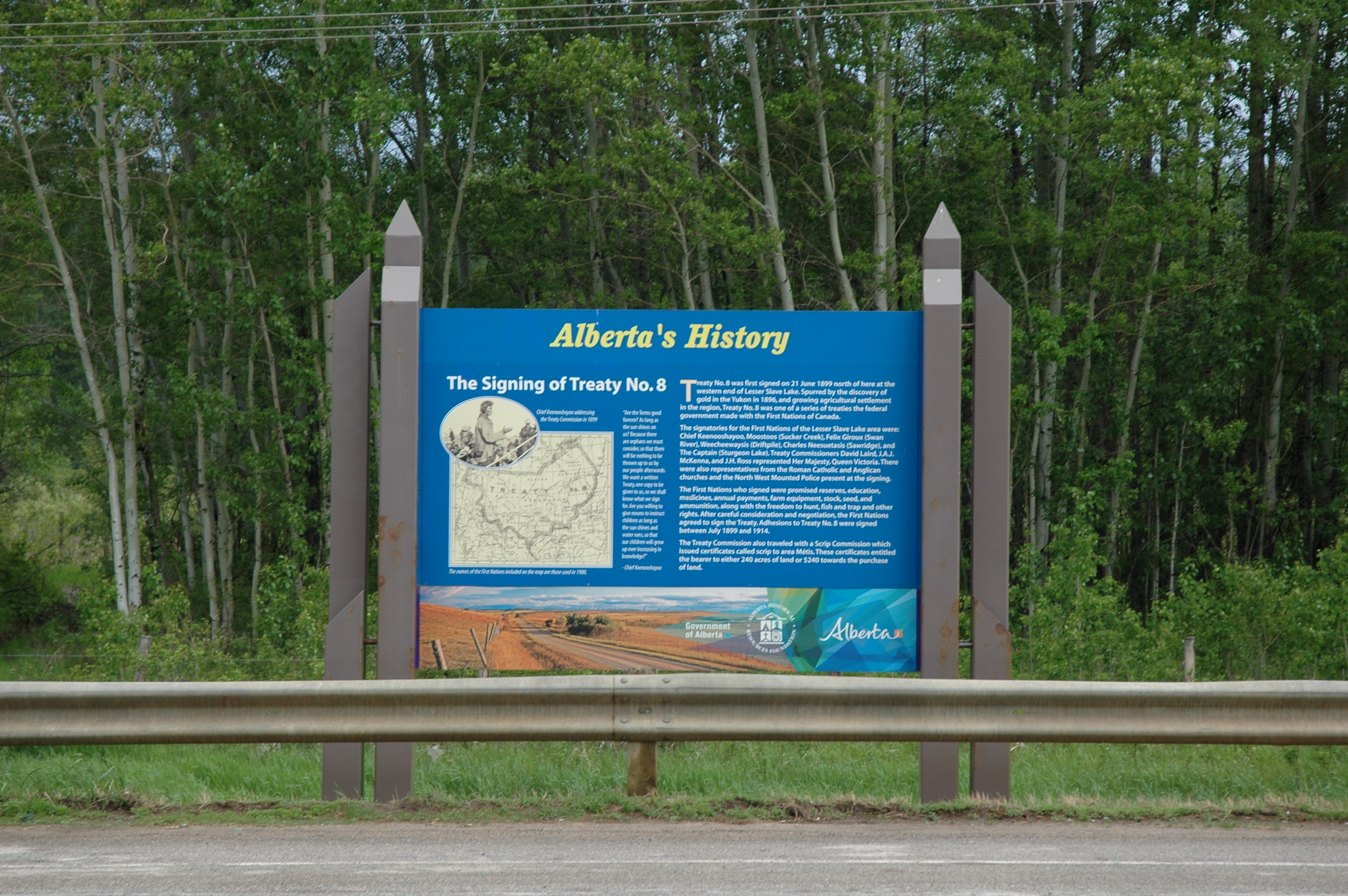 Treaty No. 8 was first signed on 21 June 1899 north of here at the western end of Lesser Slave Lake. Spurred by the discovery of gold in the Yukon in 1896, and growing agricultural settlement in the region, Treaty No. 8 was one of a series of treaties the federal government made with the First Nations of Canada.