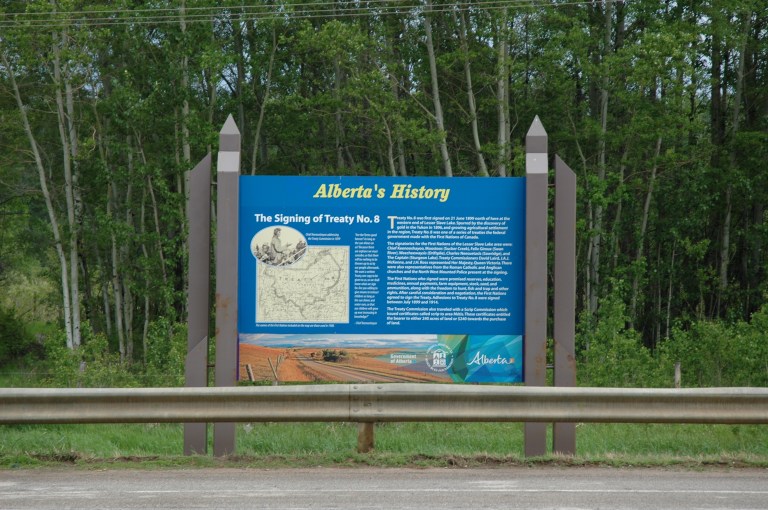 Driving towards High Prairie on Highway 2, I encountered this roadside sign a few kilometres past the western tip of Lesser Slave Lake. Stopping to read it, I didn’t realise how close I was to the place where one of the numbered treaties was signed.