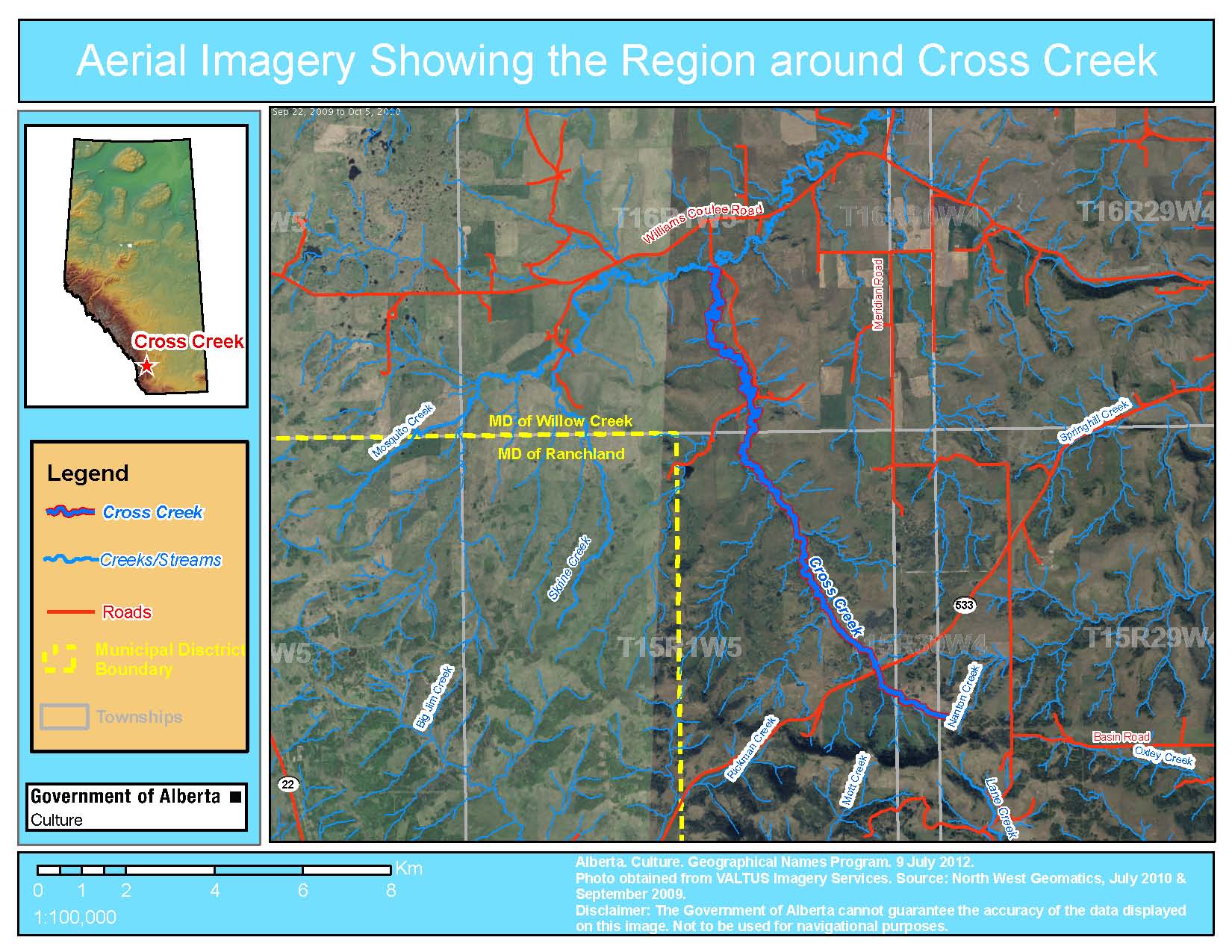 In July 1938, a series of memos were sent between various officials and representatives of the Geographic Board of Canada (GBC) regarding the approval of names in the Stimson Creek region of southern Alberta. One of these memos concerned Cross Creek; F. P. DuVernet (a member of the federal topographical survey) suggested that the creek be named Cross Creek after “the well known family in the locality who owns or controls the land through which the creek flows.” The suggestion met the approval of the GBC, but concerns were expressed about getting the consent or opinion of the Government of Alberta. Alberta had not sent a representative to the GBC for most of the 1930s. The records of the Alberta Geographical Names Program do not include any communication with provincial officials in the 1930s, so it is not clear whether Alberta’s opinion or consent was ultimately secured. However, the name Cross Creek was officially adopted at the December 12, 1939 meeting of the Geographical Board of Canada.