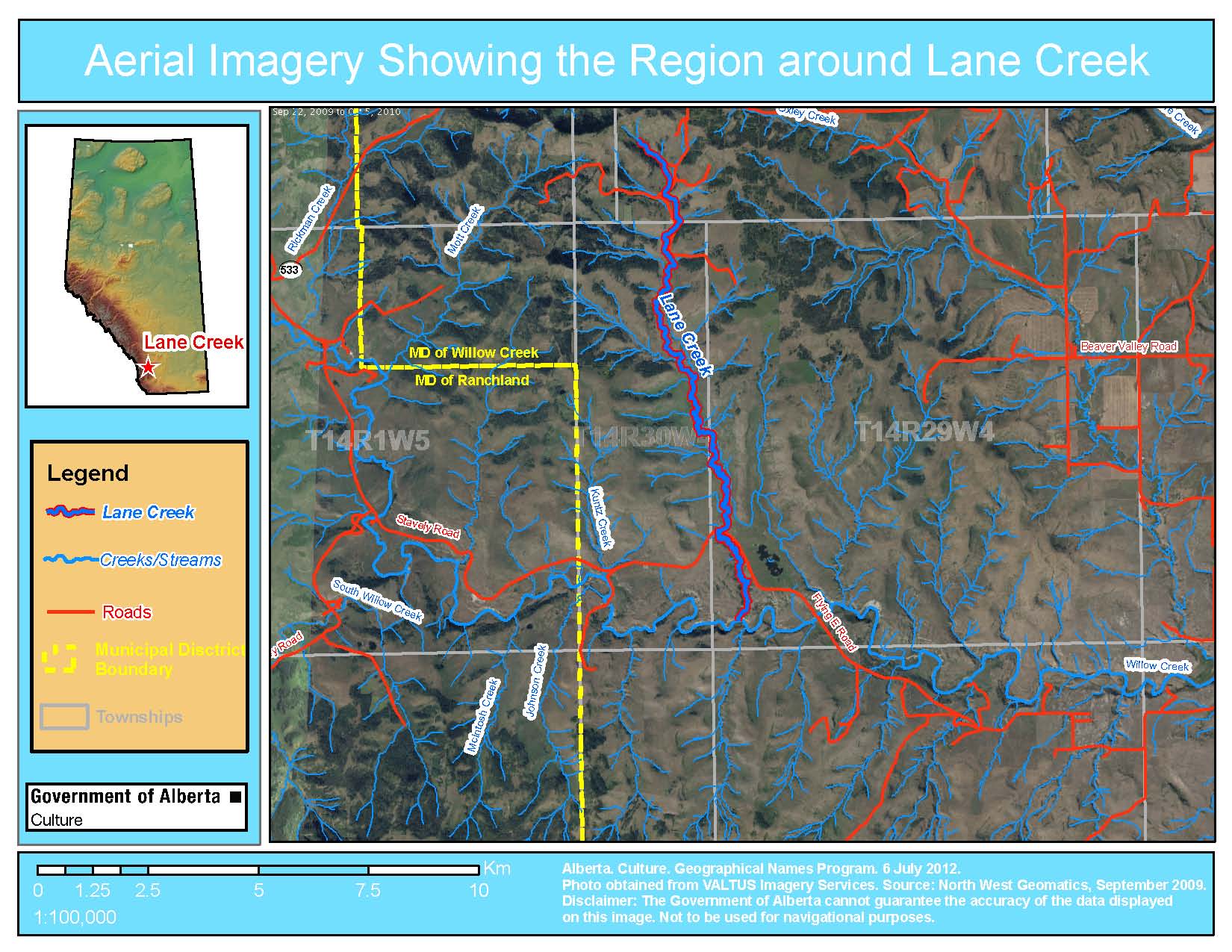 In 1883, John Francis of the Dominion Land Survey, surveyed the Township 14-30-W4. In Sections 13, 24 and 25 he recorded a spring fed creek that was approximately six feet wide and contained about eight inches of water. Francis did not name the creek. The first official recording of the name Lane Creek appears to be on the 1902 edition of the Macleod Sectional Sheet (No. 74), printed by the Government of Canada. The creek flowed through a substantial part of the land controlled by George Lane. The section where Lane Creek joins Willow Creek was co-owned by Lane and his partners Gordon, Ironside & Fares.