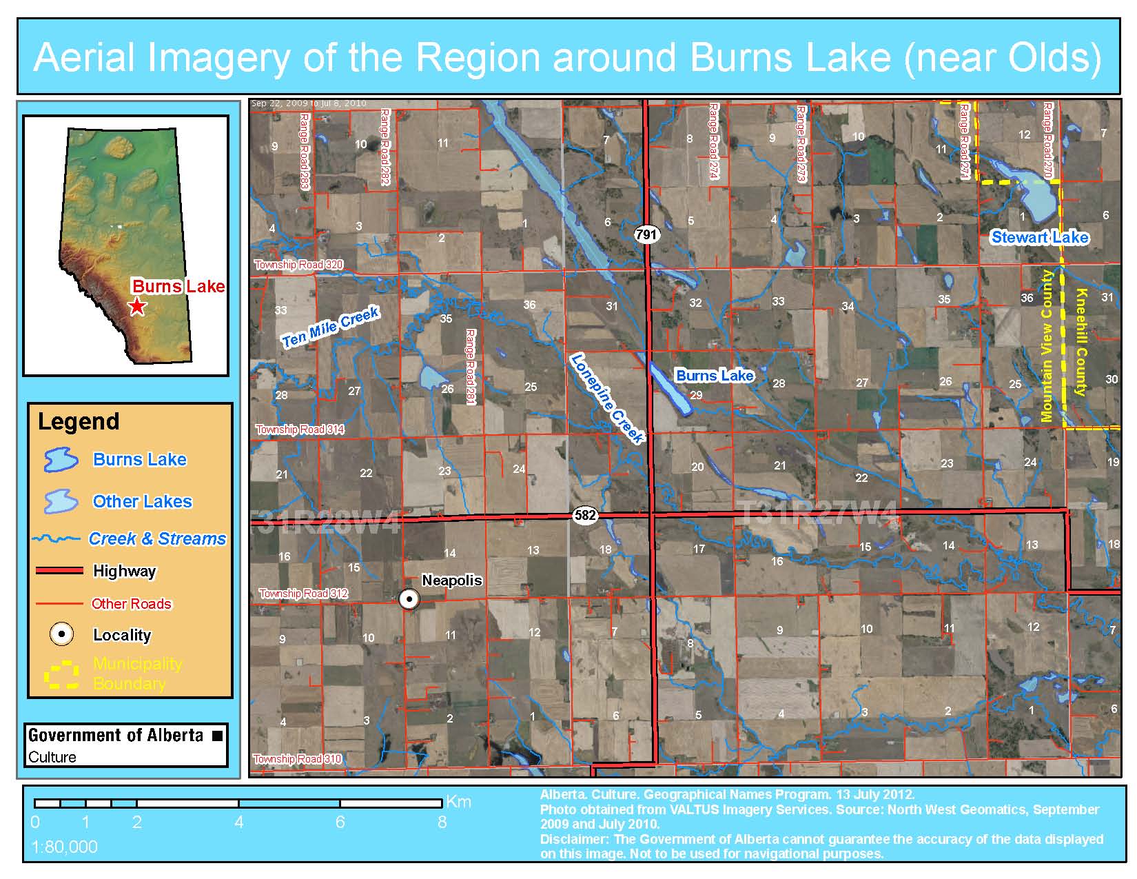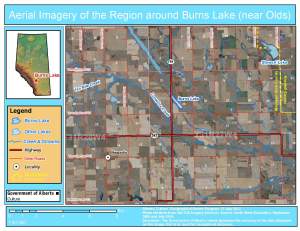 The second Burns Lake in Alberta is located near the Town of Olds. It is approximately 22 hectares (54 acres) in size. It is located in the County of Mountain View, about 25 km south east of the Town of Olds and 22 km east of the Town of Didsbury. Pat Burns operated ranches in the general vicinity of this lake. In 1922, S. L. Evans of the Dominion Land Survey recorded the name of the lake as Burns Lake on the plan he drew for Township 31-27-W4. The name was officially adopted by the Geographic Board of Canada for mapping purposes on January 20, 1955.