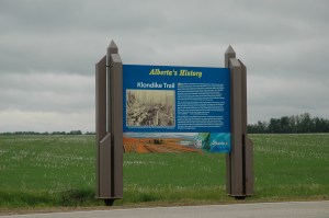 Driving westward on Highway 18, I found this roadside sign a few kilometers east of the Highway 33 intersection, near the Town of Barrhead. Stopping to read it, I learned how close I was to the “all Canadian” route to the Klondike, used during the gold rush. Continuing on my way, I used part of the trail (now Highway 33) to get to High Prairie.