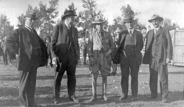 The Big Four with HRH Edward, Prince of Wales at the EP Ranch, 1923 LtoR: Pat Burns; George Lane; Edward, The Prince of Wales; Archie McLean; and A. E. Cross. (Provincial Archives of Alberta, A2658)