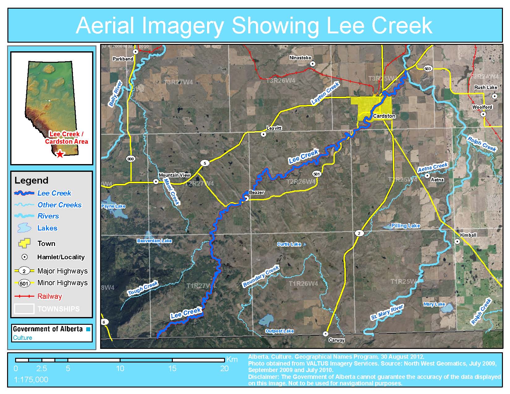Lee Creek is located in south-western Alberta. It rises within Montana’s Glacier National Park and flows generally north-easterly, crossing into Canada about 16 kilometres west of the Carway, AB / Peigan, MT border crossing. It continues to meander generally north-easterly for about 60 km (35 km as the crow flies), passing through the Town of Cardston before joining the St. Mary River in Section 23, Township 3, Range 25, West of the 4th Meridian (approximately 60 km south-west of Lethbridge).