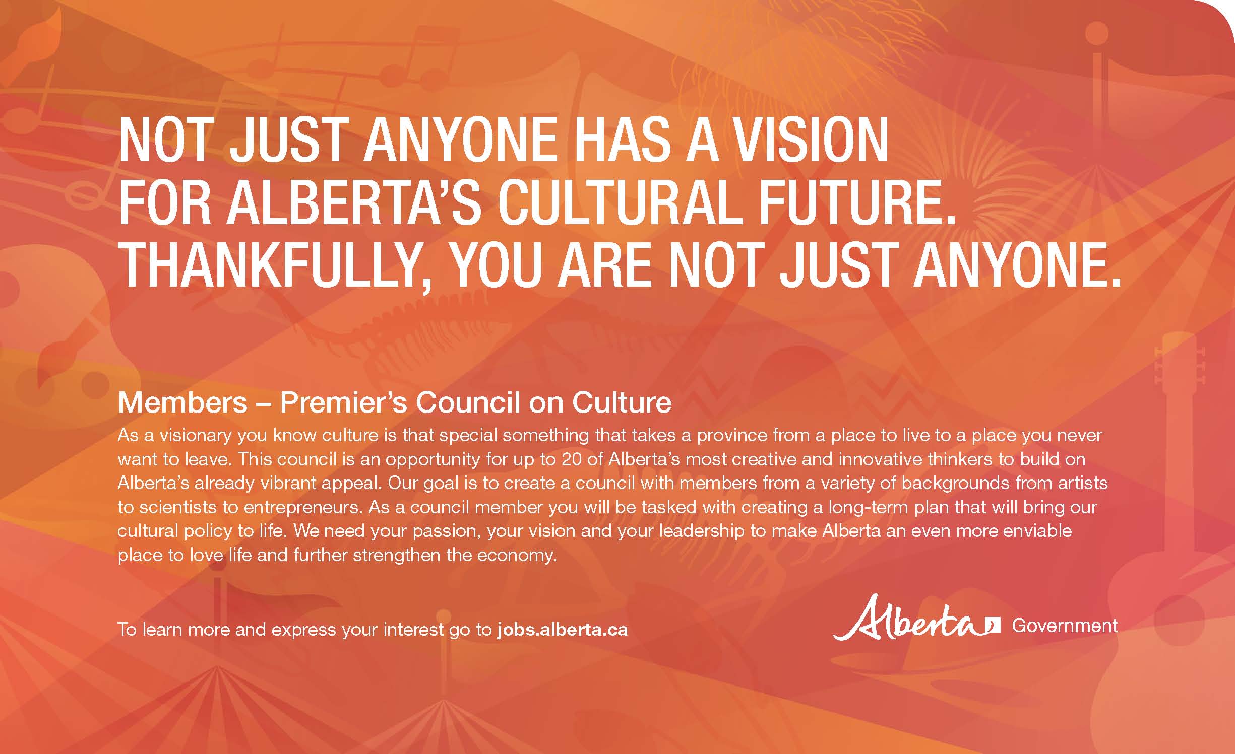 As many of you may already know, on January 9, 2013, Minister of Culture Heather Klimchuk launched a recruitment process for members of the Premier’s Council on Culture. Members will represent the range of sectors responsible for cultural activities and experiences – the arts, heritage, multicultural and nonprofit/voluntary organizations, as well as creative and cultural industries, youth and corporate partners.