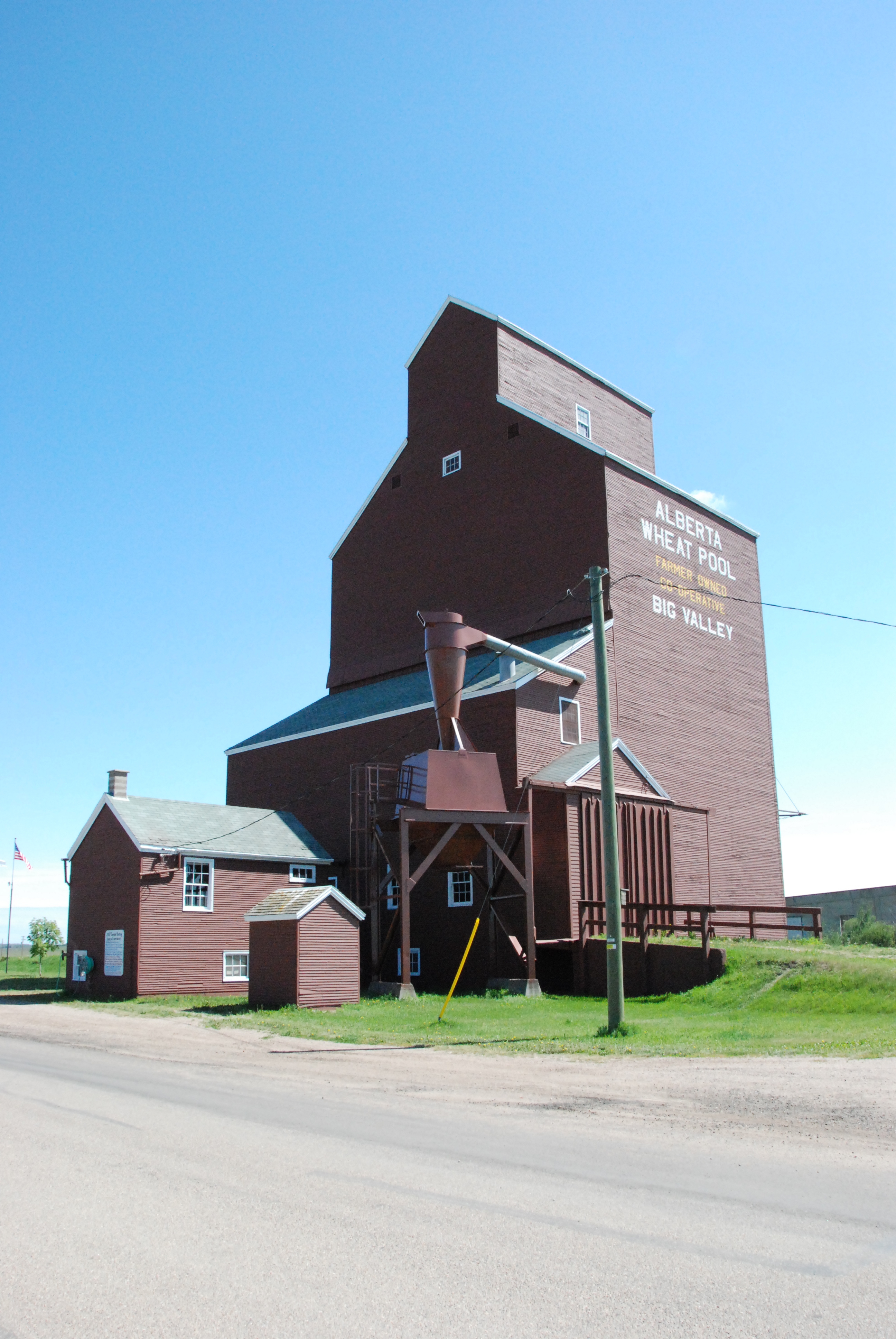 Today’s blog post will no doubt please all of our railroad and grain elevator enthusiasts out there in the ether. On August 27, 2012, the Alberta Wheat Pool Grain Elevator in Big Valley was designated as a Provincial Historic Resource and added to the Alberta Register of Historic Places. This grain elevator has heritage significance due essentially to the fact that it is…, well, it’s a grain elevator. These once dominant, landmark structures in rural Alberta have become iconic symbols, speaking to the province’s agricultural, social and railroad transportation history. This particular elevator also contributes to the cultural landscape of Big Valley, aiding in the visual communication of the community’s history as one of the province’s busiest railroad divisional points.