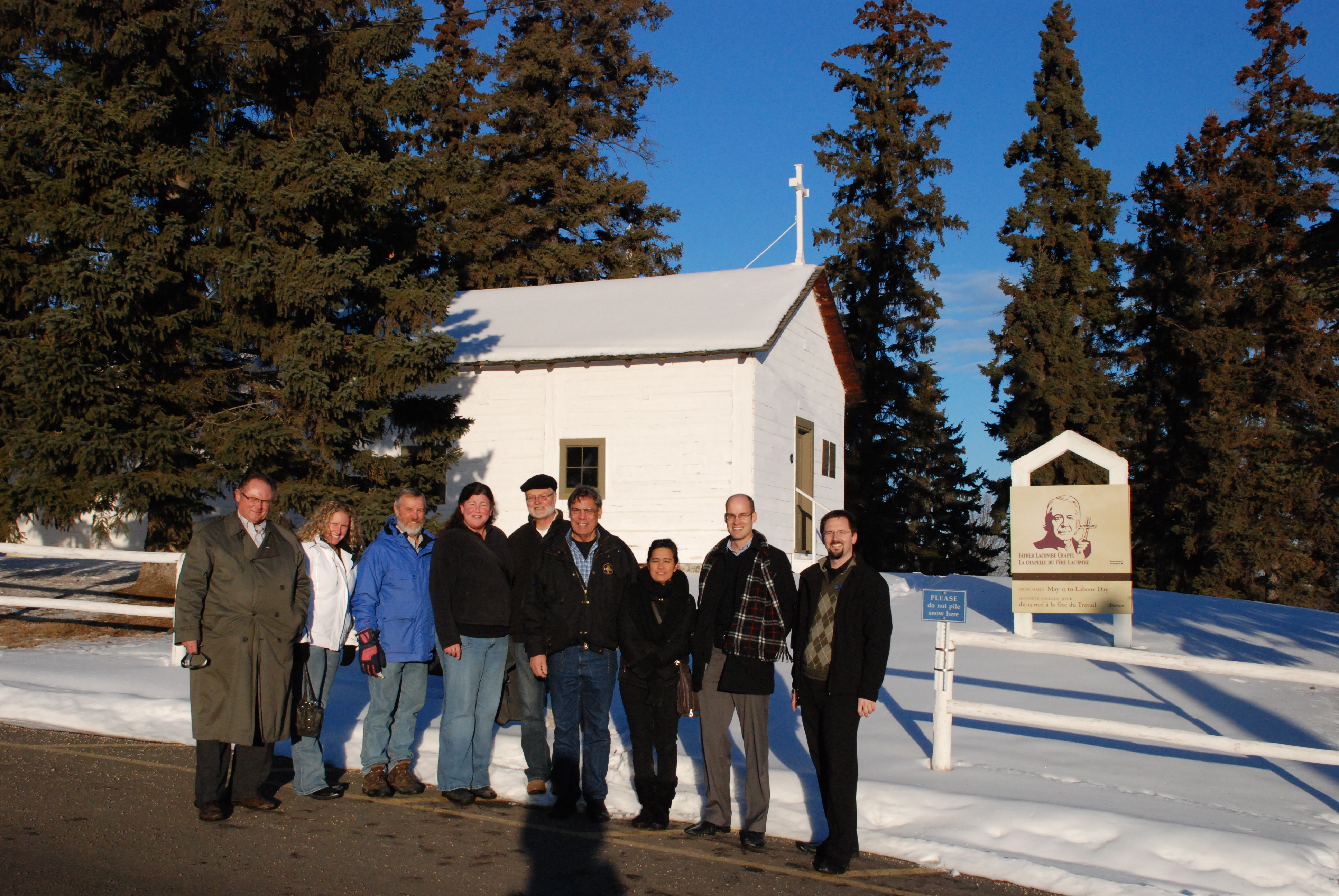 AHRF Board Members and Alberta Culture staff outside of the Father Lacombe Chapel in St. Albert; (Left to Right: Bob Gaetz, Leah Millar, Don Totten, Laurel Hallliday, Board Chair Fred Bradley, Tom Clark, AHRF Grants Program Coordinator Carina Naranjilla, Executive Director Matthew Wangler, and Manager, Municipal Heritage Services, Matthew Francis)