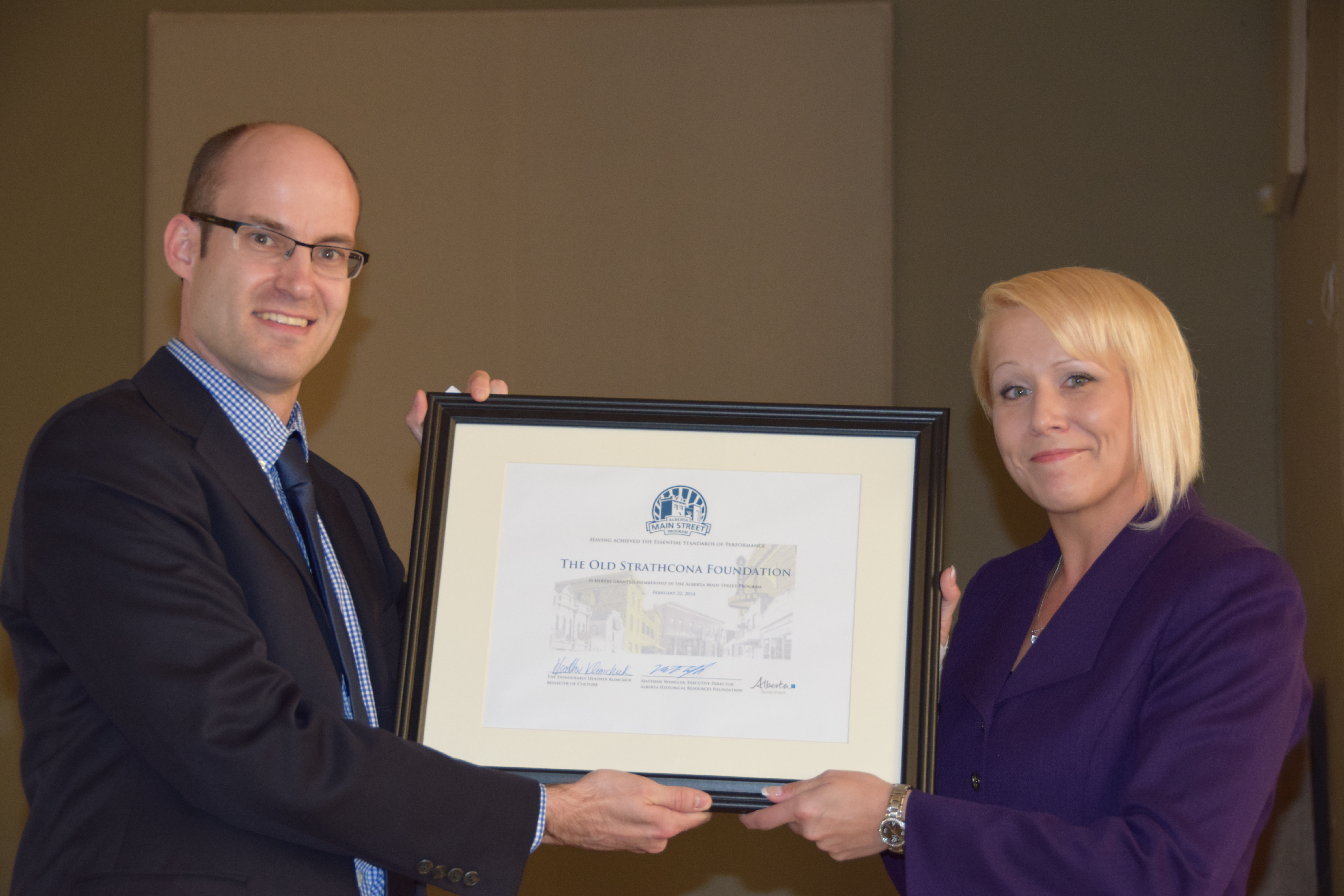 Alberta Historical Resources Foundation Executive Director Matthew Wangler presents the Alberta Main Street Program Membership to Angie McDow, President of the Old Strathcona Foundation.