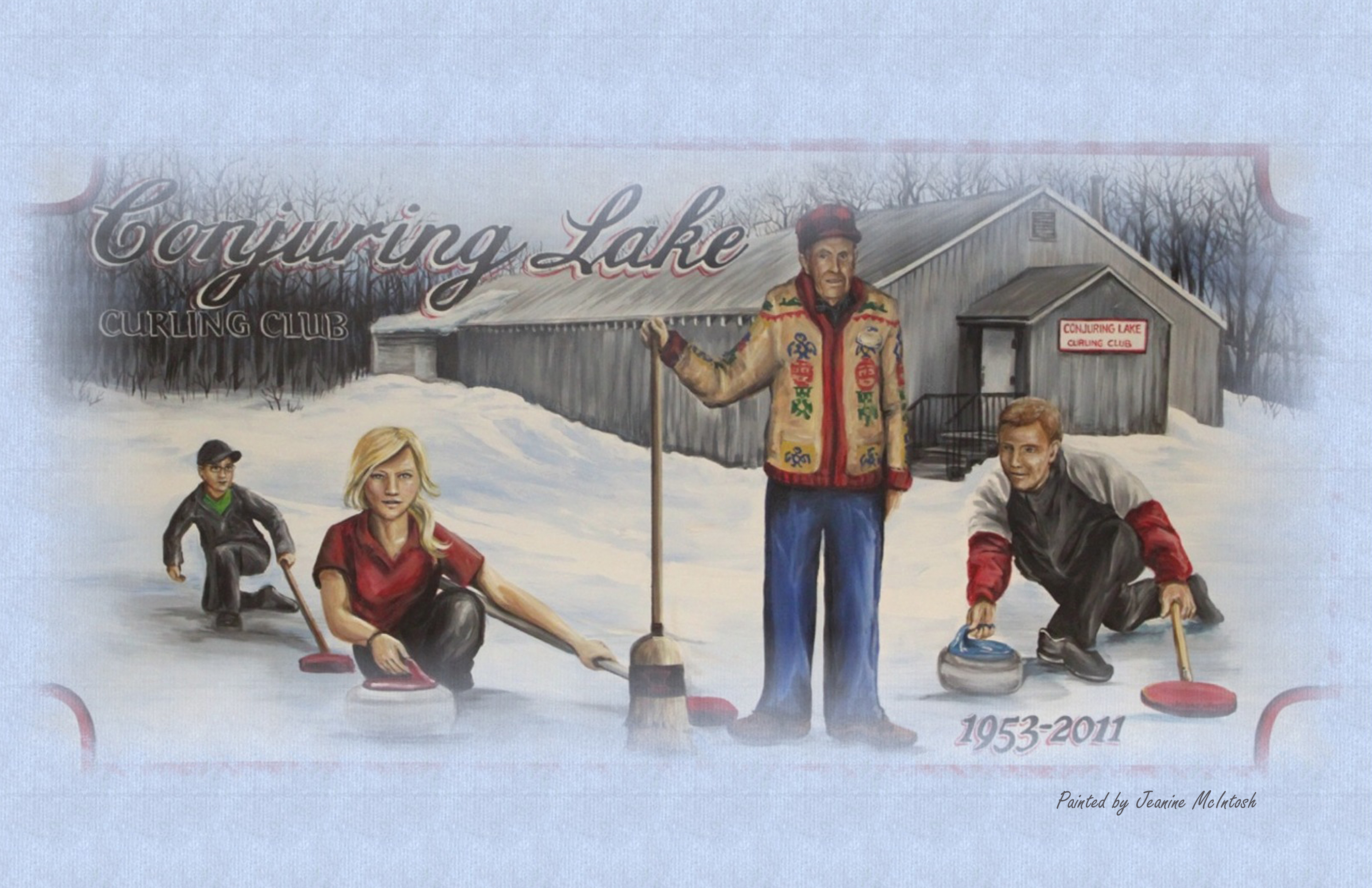 The mural painted in the Calmar Curling rink to commemorate the Conjuring Lake curling Club. (Photo courtesy of the Conjuring Lake Curling Club.)