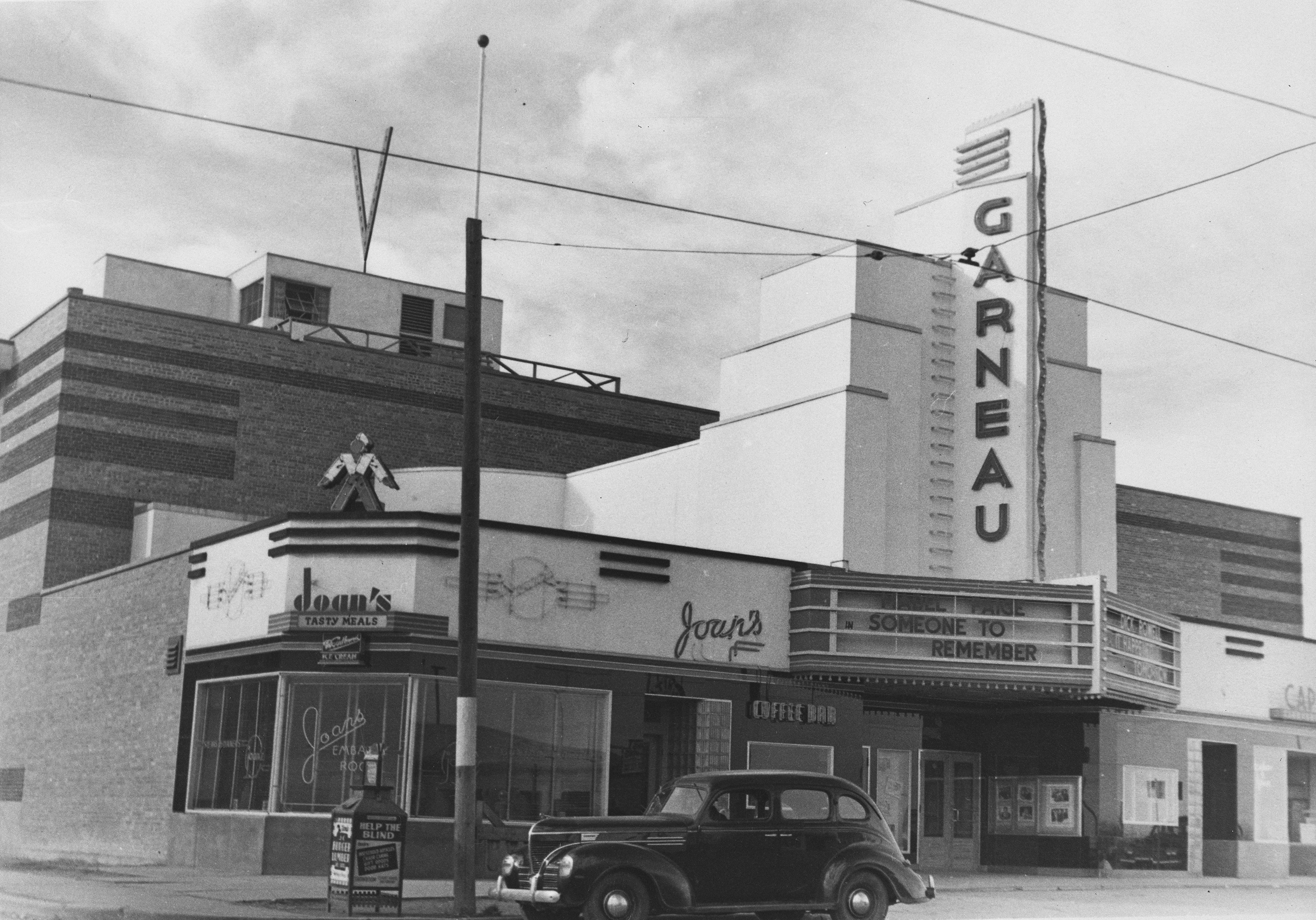 By the 1940s the wartime economy fueled the love of cinema to greater heights. Surviving older multipurpose theatres such as the Empress Theatre in Fort McLeod experienced a new lease on life as a movie theatre. Bashaw’s Majestic Theatre, built in 1915, which had operated as a silent picture house through the 1920s but subsequently fell on hard times, reopened in 1945 as the Dixy. At the same time cinemas began to move out of the downtown core. In Edmonton two rival theatres appeared on the south side in 1940, the Varscona and the Garneau Threatre, both designed specially as cinemas in the modernist Art Deco style that was emerging in the city and across the province. At the Garneau fashionably uniformed ushers escorted patrons to their seats, which included a new twist—“two’s company” love seats for young couples.