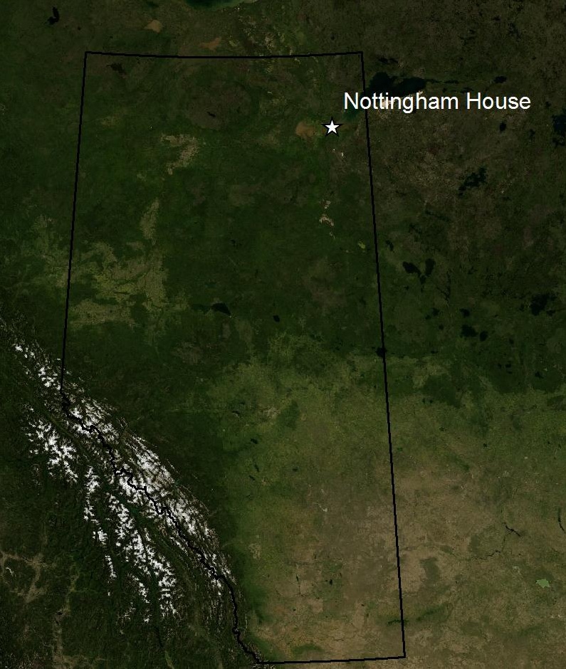 Nottingham House was a fur trade post established by the Hudson’s Bay Company (HBC) in 1802. The HBC hoped to compete with the North West Company (NWC), who held a 20 year monopoly on the famed fur-rich areas of the Athabasca region. Peter Fidler, an experienced HBC surveyor, along with his Swampy Cree wife, Mary, their children and 17 other explorers arrived at Fort Chipewyan in late 1802 to set up the new trading post, Nottingham House. In the style of competitive exploration that characterized the fur trade in western Canada, Nottingham House was erected less than a mile from Fort Chipewyan, a successful NWC trading post established in 1788.