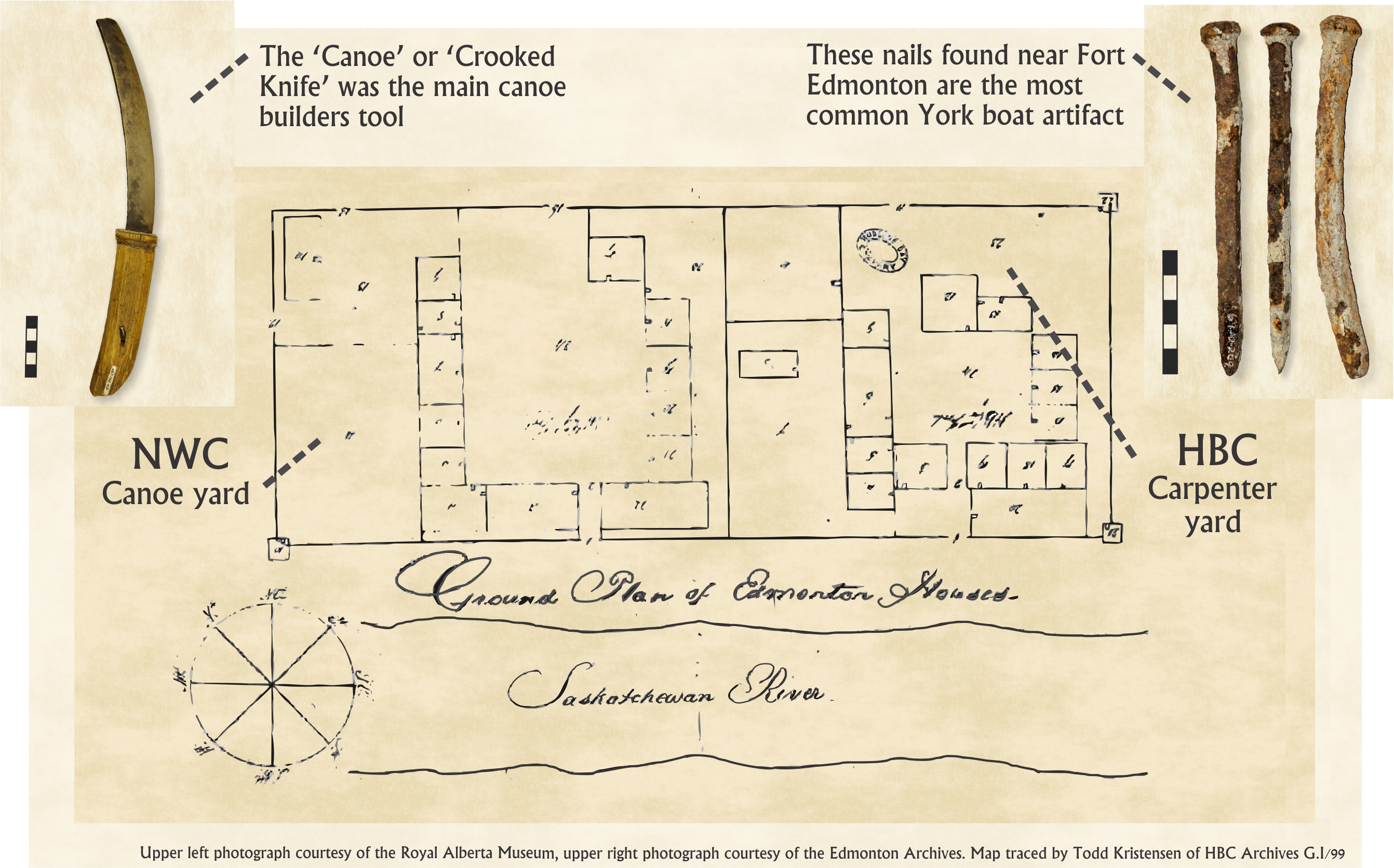 The first European fur traders adopted an eastern Algonkian-style of birch bark canoe. Every year, hundreds of men and women in Alberta gathered supplies and moulded lightweight ‘Express’ canoes at major fur trade boat building centres like Fort Chipewyan, Fort Edmonton, and Rocky Mountain House. While canoes and other physical traces of boat building at these forts have long since decayed, other lines of evidence of early boating are preserved. Trading posts needed access to good birch and it is no coincidence that the locations of old forts are now surrounded by place names containing ‘birch’. Fort Chipewyan neighbours the Birch Mountains (first called the Bark Mountains by early traders) and there are many Birch Flats, Birch Lakes, and Birch Creeks named for their source of boat supplies. Henday camped by the ‘Birch Hills’ near Edmonton in 1755 when he and his party built 35 canoes to send furs to Hudson Bay.
