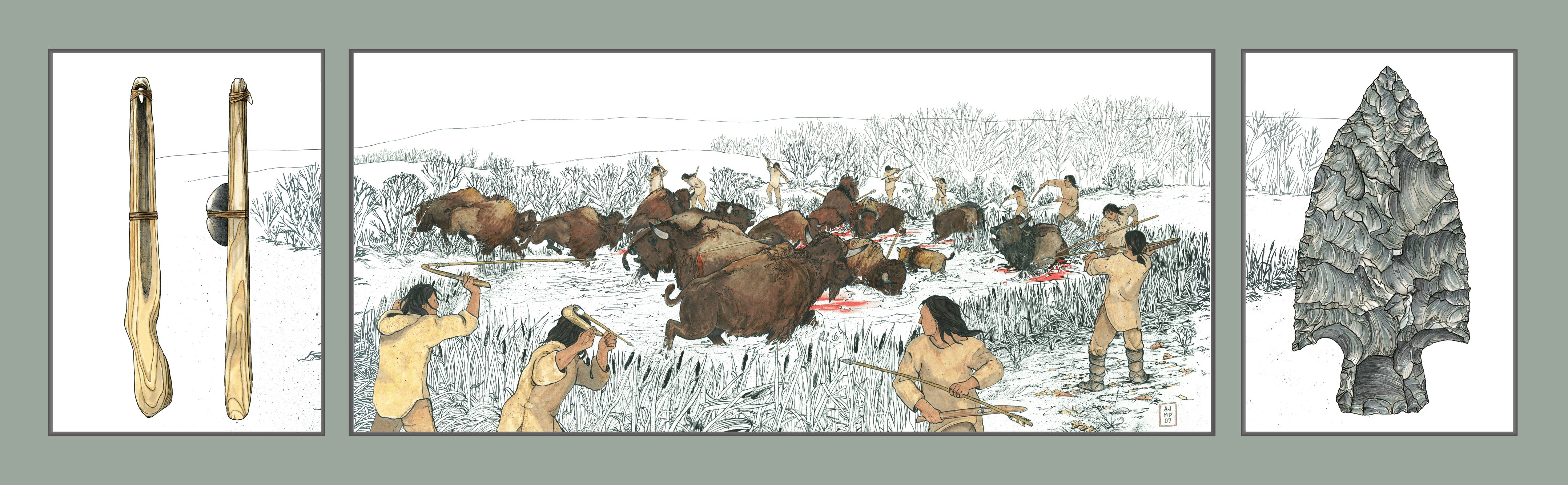 The Heritage Art Series is a collaboration of the Historic Resources Management Branch, the University of Alberta, and the Royal Alberta Museum. Each artwork shares an important story about the people of our province: we hope it fosters a greater awareness of our past and instils a deeper respect for it. The scene below and the artifact illustrations in this blog are by Amanda Dow, a Calgary based artist and archaeologist. The artwork portrays both the technological details and use of atlatls at the Everblue Springs site in southern Alberta. Archaeologists strive to study not just the material record of the past but all the associated behaviours and knowledge that people relied on to survive. For over 6000 years, Alberta families depended on the successful use of the atlatl hunting system.