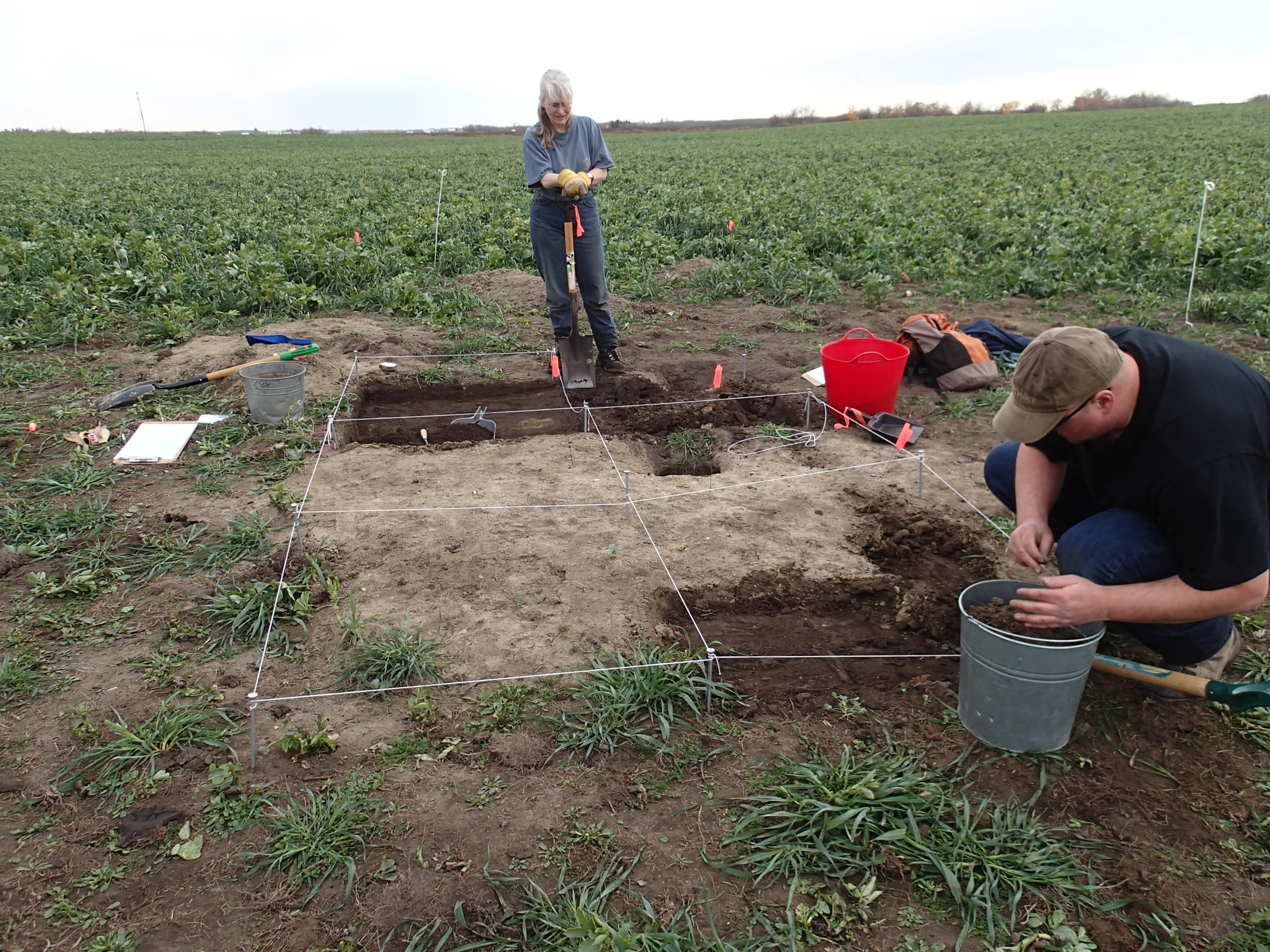 The land had been under cultivation for nearly 100 years and there were no indications of a burial being in the area so the exact location and orientation of the burial was not known. It took a day and a half of preliminary excavation, following a maze of badger and gopher holes, before the location of the intact burial was discovered. The team decided to follow one particular badger hole that extended downward to see where it would lead. Slowly, through careful excavation, several articulated vertebra were exposed.