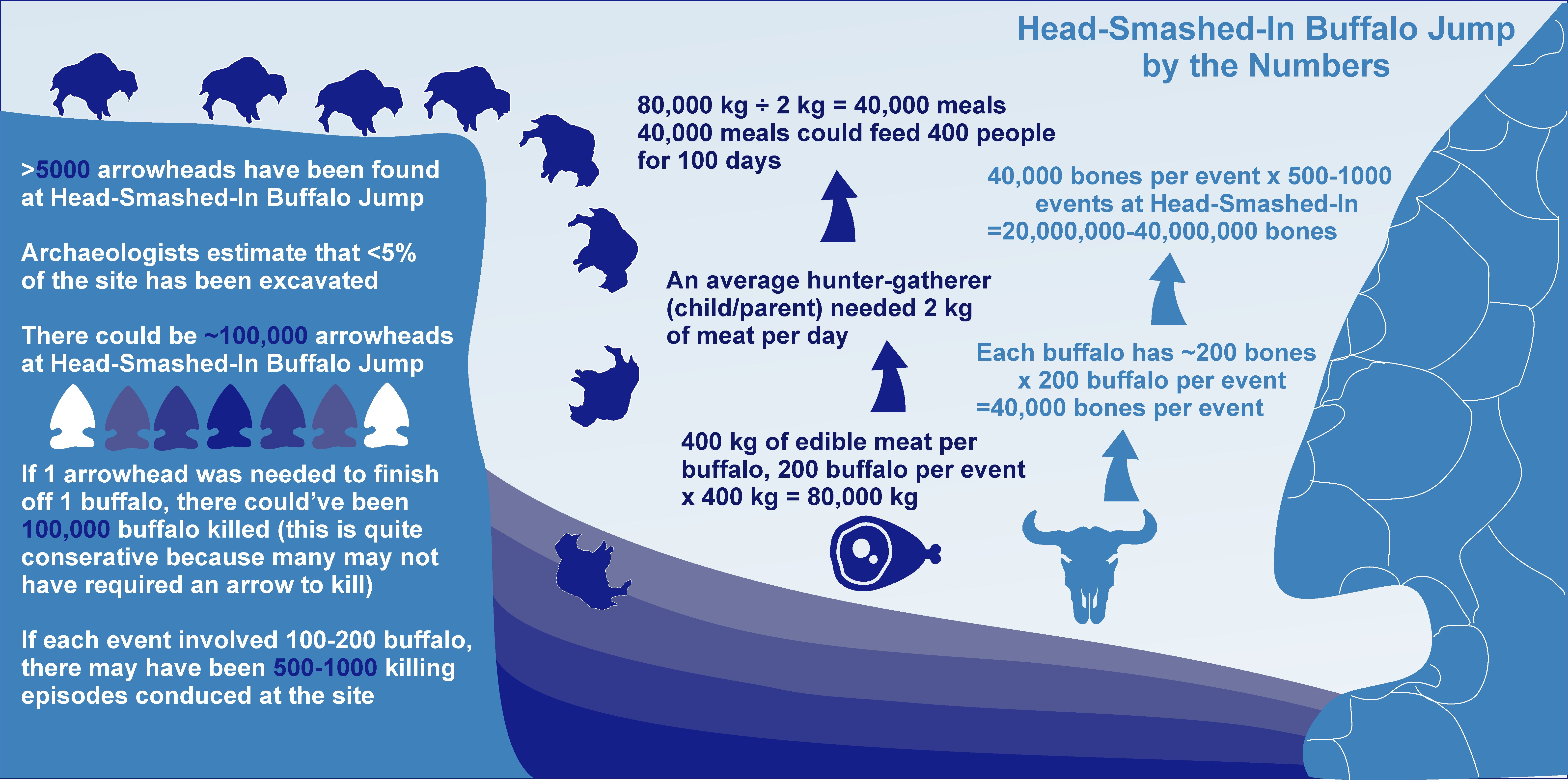 Figure 4. Like math? Like animal bones? This infographic about Head-Smashed-In Buffalo Jump is right up your alley (if you answered yes to the previous two questions). Courtesy of Todd Kristensen and Mike Donnelly based on an interview with Royal Alberta Museum archaeologist Bob Dawe.