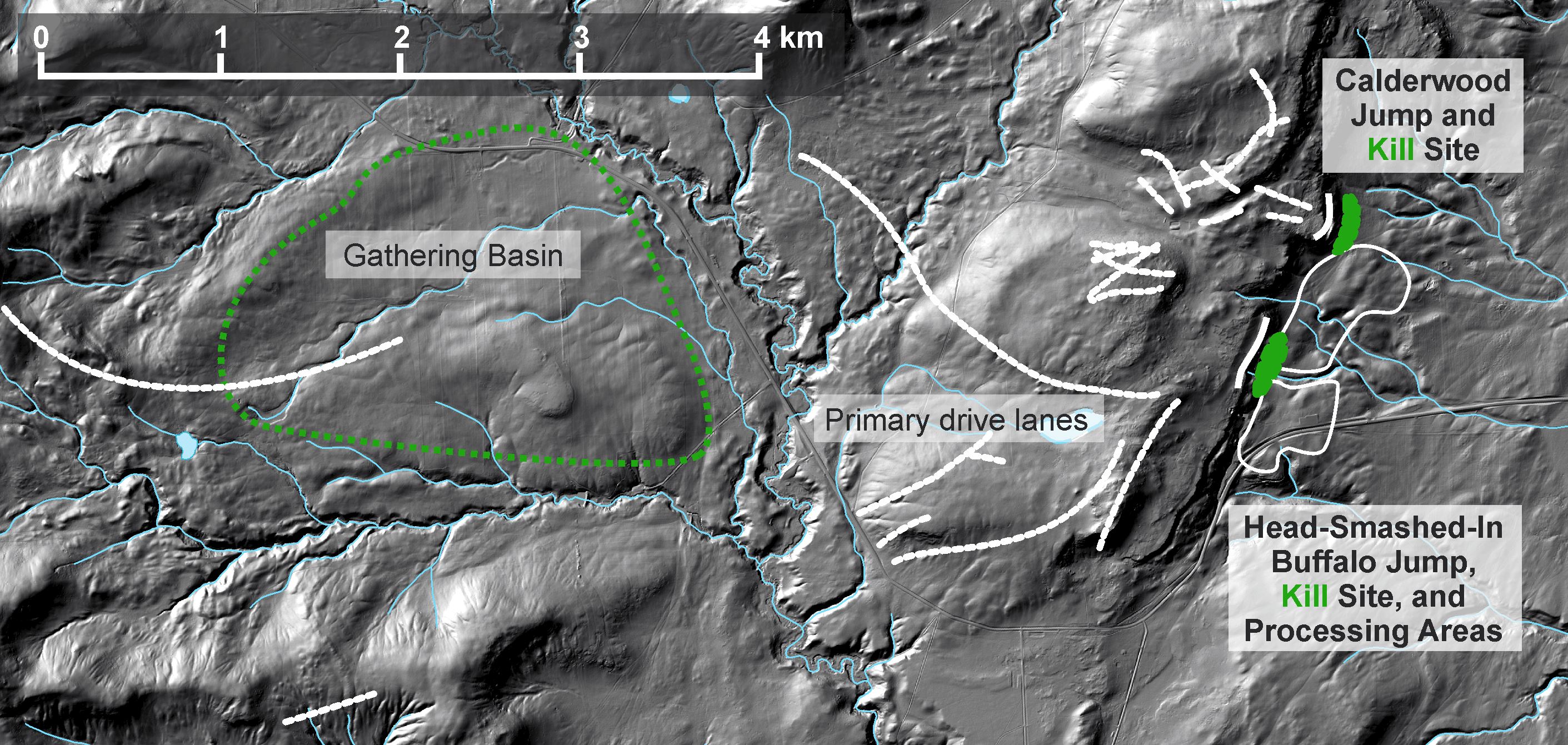 Figure 3. The cultural landscape of Head-Smashed-In Buffalo Jump encompasses a huge gathering basin that was likely burned several months in advance to produce lush grass that attracted buffalo. They were then lured to long drive lanes that corralled them toward cliff faces that offered the illusion of continuing prairies.