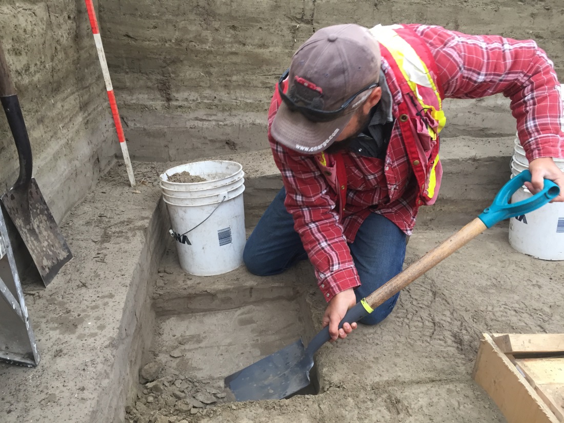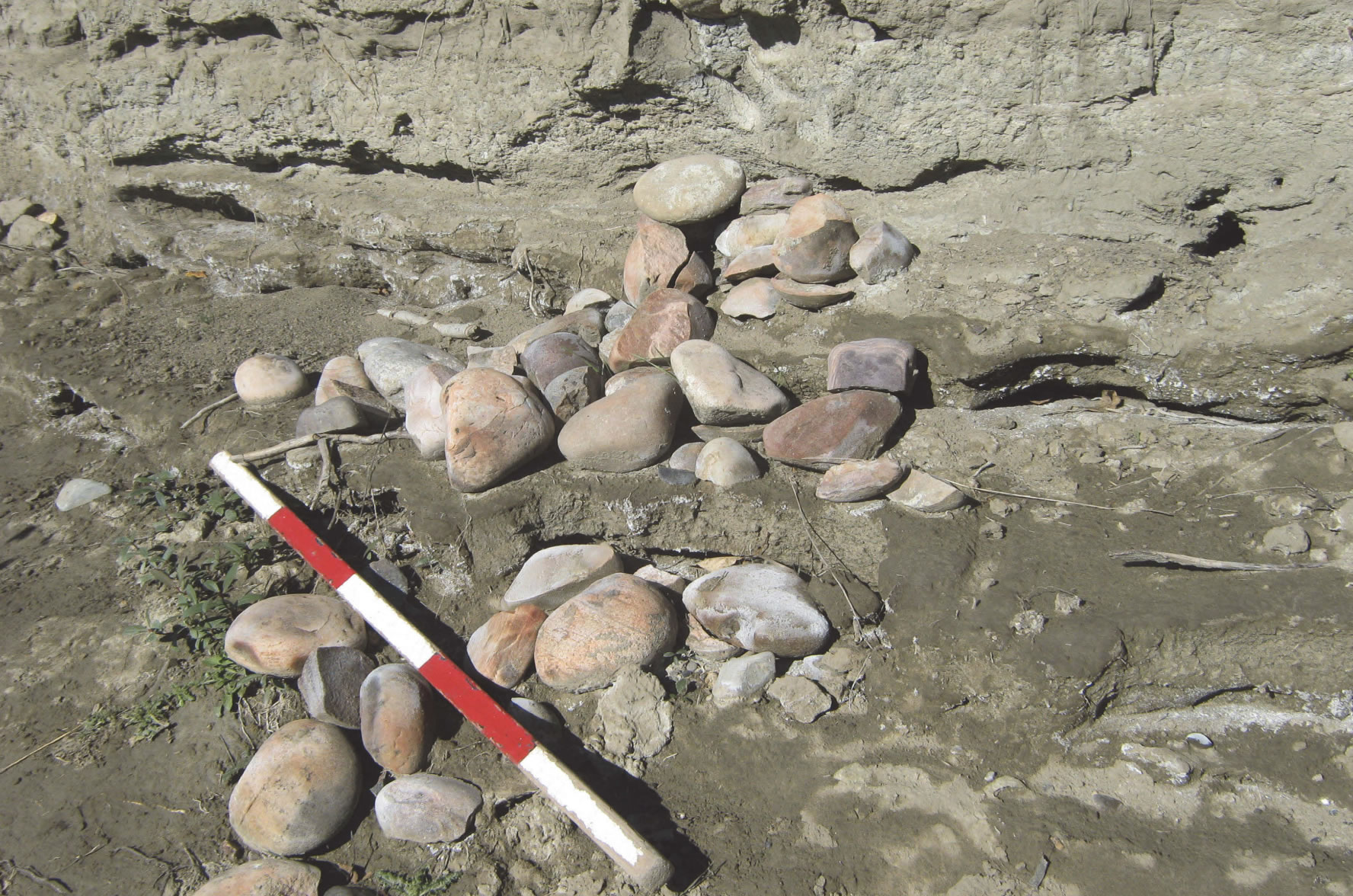 The McKinnon Flats site is one of these locations. Although it had been previously recorded in 1971, no-one realized that it contained deeply buried cultural deposits. As a result of the 2013 flood, however, a ten metre strip from the front of the site’s river terrace was removed, leaving a 400 metre exposure in the river bank that contained cultural evidence. This evidence included broken bison bone, large stone choppers and rock that had been heated and cracked in a fire. Among the eroding finds were the remains of a boiling pit that had probably been used to cook meat and process bone marrow in a skin-lined pit dug in the ground. Evidence of the pit was found in the form of almost 100 heated “fire-broken” rocks that were eroding from one of the riverbank exposures. Between the time the pit was observed in 2014 and the site was excavated in 2016, however, all evidence has been completely eroded.