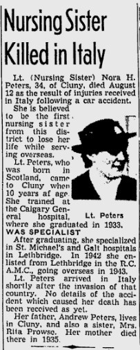 During Canada’s two World Wars approximately 127,000 Albertans served in the country’s armed forces, of who 9,500 died. During WW2 approximately 2,000 Alberta women served in non-combat roles, including within the Royal Canadian Army Medal Corps as Nursing Sisters. One of the nurses who died in uniform during WW2 was Nora Hendry Peters of Cluny, Alberta who died in Italy in 1944. Born in Scotland in 1910, Nora followed in the footsteps of her father Andy who first came to Lashburn, Saskatchewan and later Gleichen, Alberta where he worked as a blacksmith. He established his own blacksmith shop at Cluny in 1916, a business he operated until his retirement in 1956. Andy died in 1965. Norah’s mother Joan was active within the United Church, presiding over the United Church Women organization during 1928-29 and passed away in 1935.