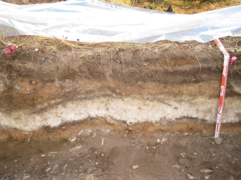 Example of a buried volcanic ash (also known as tephra) found during archaeological excavation. The ash is the lightest coloured layer in the profile, between 25 and 35 cm below the surface (between the 1 and 3 on the tape measure).
