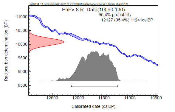 Archaeological site EhPv-8 has a radiocarbon date of 10,090 +/- 130 but the calibrated date of the site ranges between 12,127 and 11,241 calBP (before present).