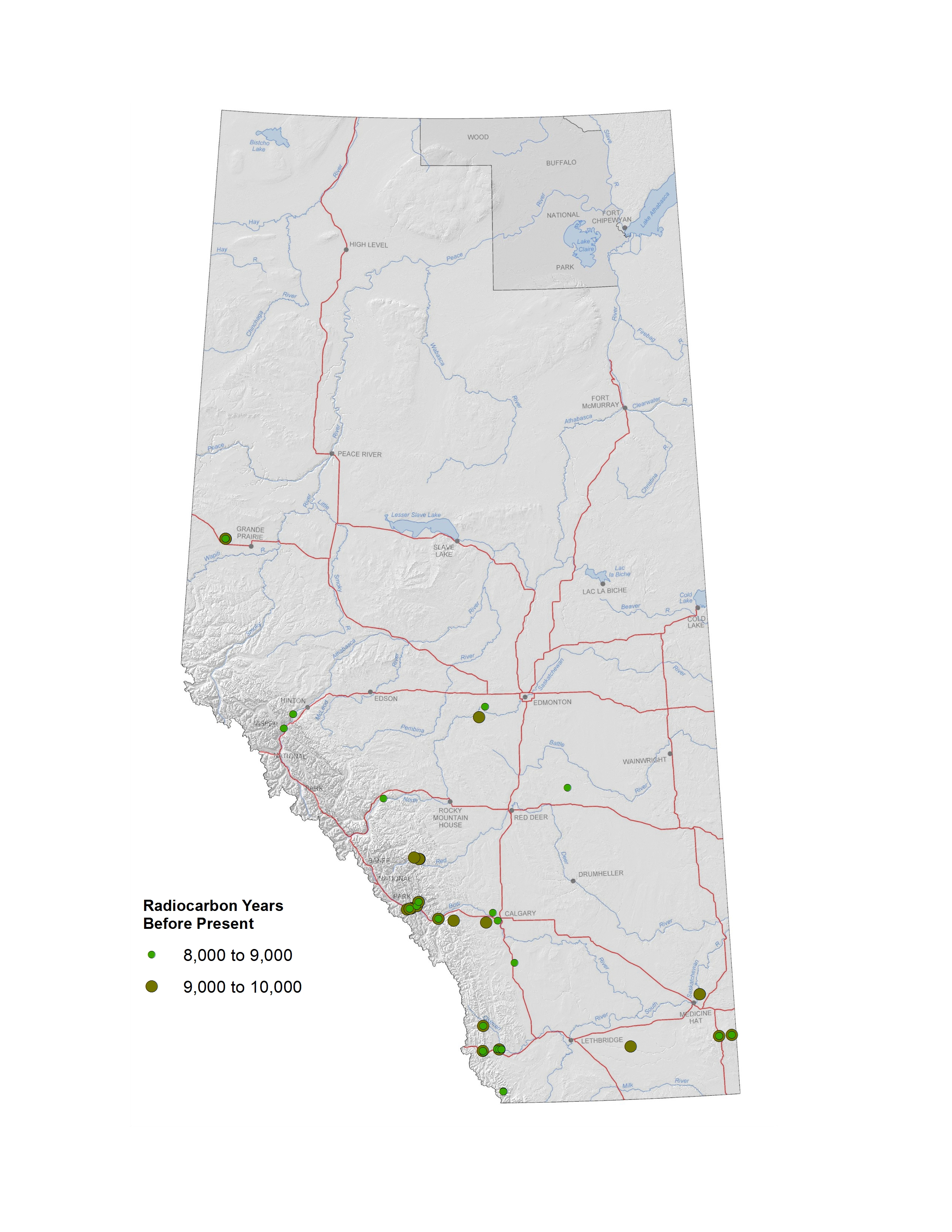 Alberta archaeological sites dating between 8,000-10,000 radiocarbon years before present.