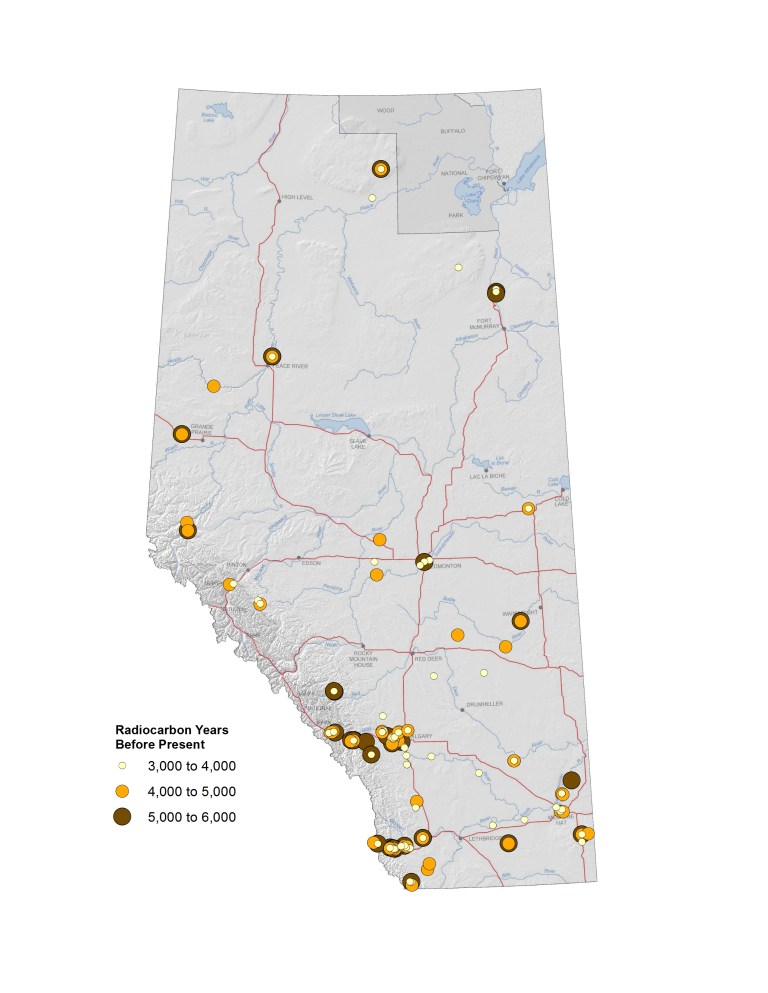 Alberta archaeological sites dating between 3,000-6,000 radiocarbon years before present.