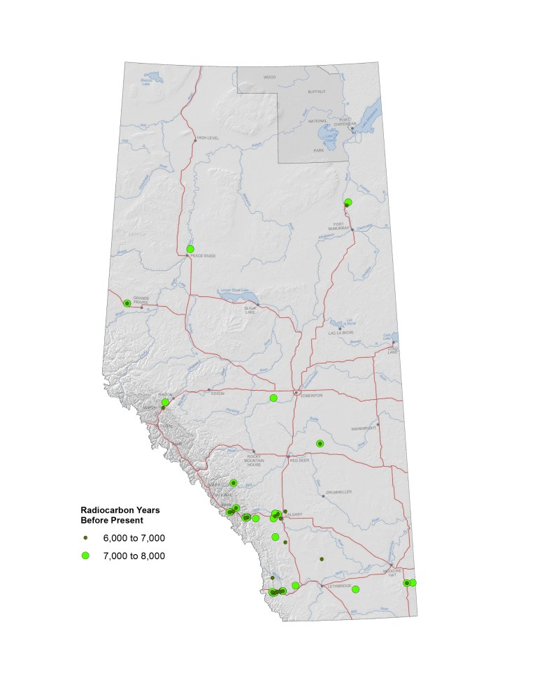 Alberta archaeological sites dating between 6,000-8,000 radiocarbon years before present.