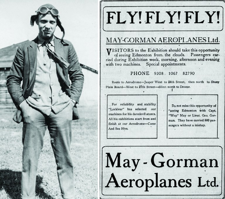 Left: Wop May in Saskatoon, 1919 (Courtesy Denny May); Right: The Edmonton Bulletin, July 5, 1920. The ad also mentions that “Locklear” would be performing, and using the May-Gorman aeroplanes. Ormer Locklear was a famous stuntman and “Wing Walker.” He would be killed in a fiery crash a month later, filming a stunt for the Fox Film Corporation in California.