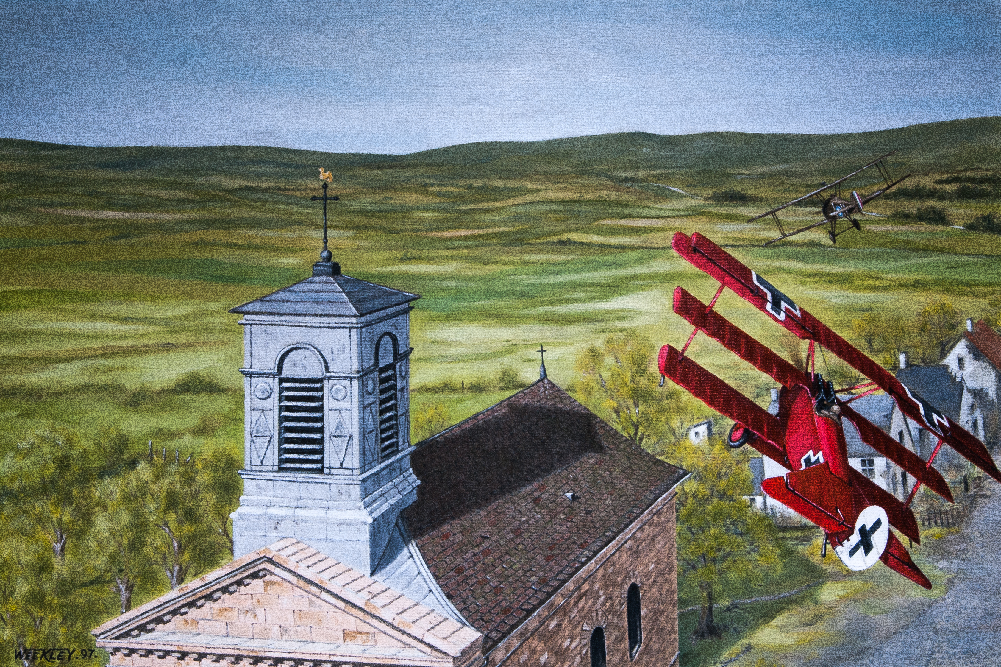 Wop May being pursued by the Red Baron through the French village of Vaux- sur-Somme, with the Morlancourt Ridge in the background, April 21, 1918; painting by Barry Weekley (Courtesy Denny May).