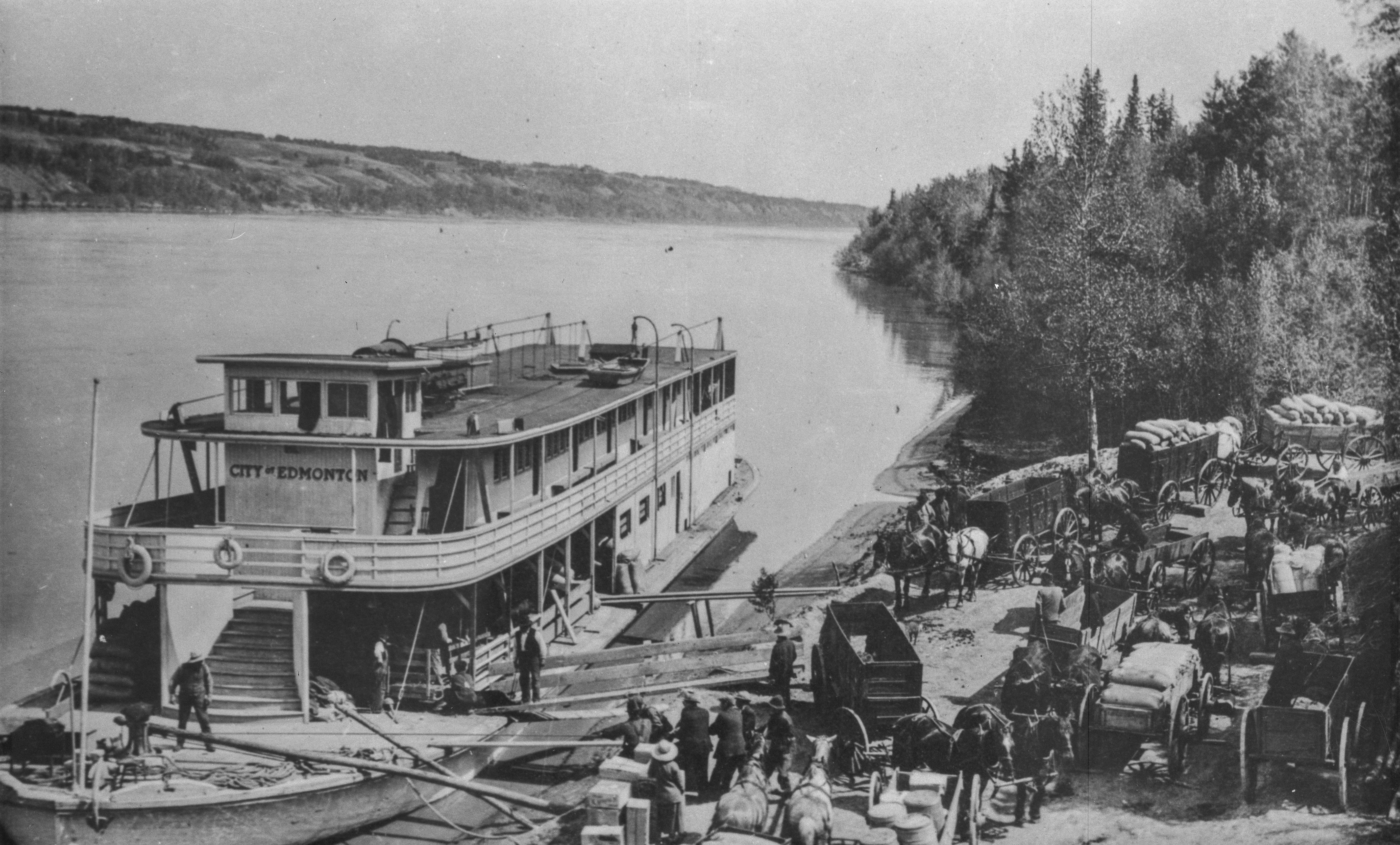 Paddle Steamer “ City of Edmonton”, 1910. Description: “The City of Edmonton” paddle steamer being loaded at dock. Image courtesy of Provincial Archives of Alberta A7011.