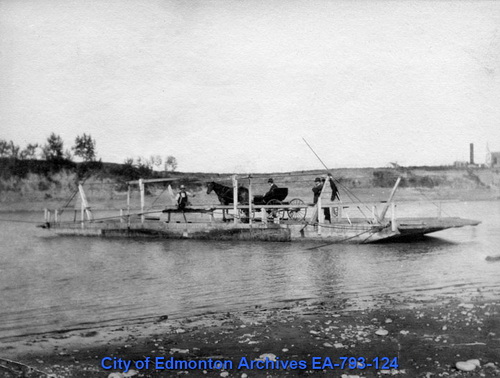 Walter’s Ferry, 1909. Description: John Walter’s ferry carrying a horse and buggy across the North Saskatchewan River. Photographed by Gordon Wilkins. Image courtesy of City of Edmonton Archives EA-793-124.