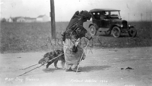 One of the most fascinating aspects of historic human-dog interactions among Alberta’s Indigenous groups is the gendered nature of such relationships. Dogs were responsible for lessening the workload of Indigenous women, be it moving the entire camp, or quotidian tasks like collecting firewood or bringing in the spoils of the men’s hunt. Among the Nehiyawak, dogs belonged to women4. Dogs were thought to be useless for hunting, therefore of little routine use to men. Because women carried out domestic tasks that involved the use of dogs, including transport of the tipi and other parts of the household, they were responsible for training their pups to wear harnesses and to eventually pull travois. To keep fighting to a minimum, they castrated their male pups, leaving the larger ones intact for breeding purposes. Though a man might be said to be “rich in dogs,” he was required to ask his wife before selling or gifting any of her dogs. Kanai women crafted their own travois, which were so central to historic women’s life on the Plains that when a Kanai woman died, it was said she had “gone to make her travois.”5