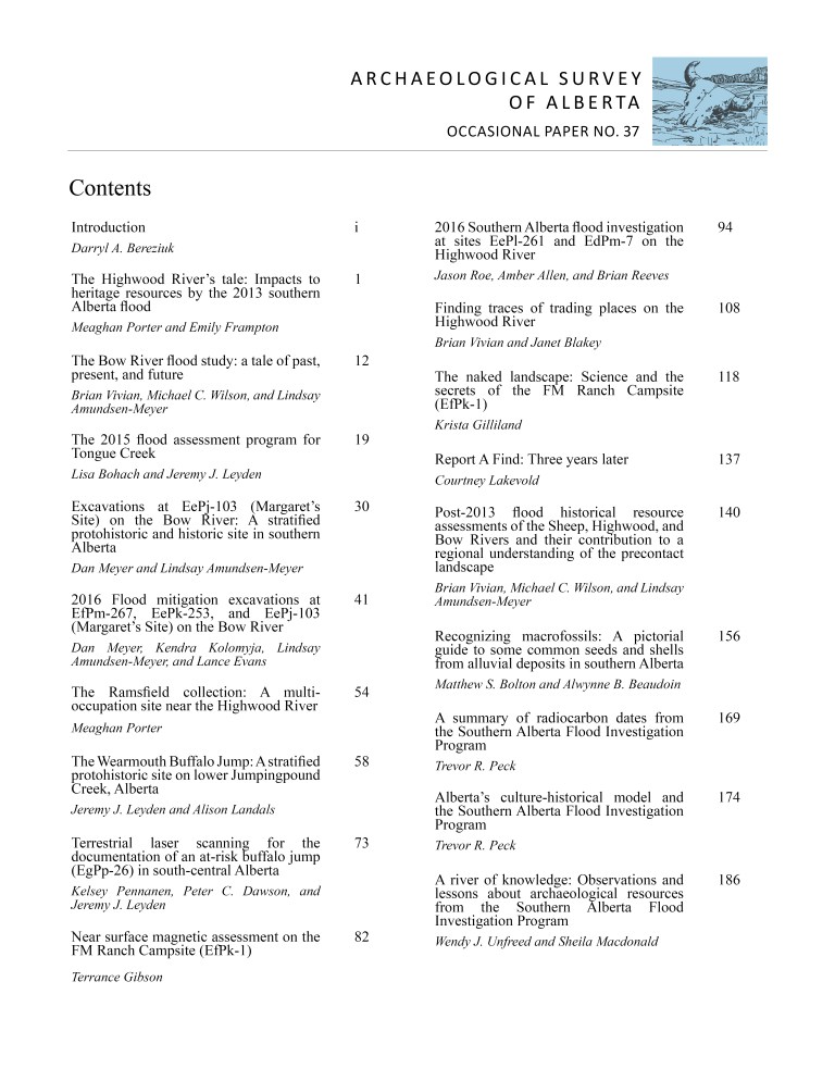 The Occasional Paper Series (nicknamed the Blue Book) offers a venue to share information about historic resources and to stimulate, illuminate, and debate the records and practices of archaeological work in the province. The 2013 flood was a devastating reminder that interpretive potentials of historic resources can be threatened by natural catastrophes. The articles in this volume showcase methods, techniques, and approaches to document historic resources while sharing some of the exciting new discoveries encountered during surveys and excavations conducted under the Southern Alberta Flood Investigation Program. In particular, new insights have been gained regarding Alberta’s Protohistoric Period, whiskey trade posts, a new bison jump, the use of macrofossils to reconstruct past environments, methods of digitally capturing landforms, and remote sensing techniques to document subsurface features. We hope this work spurs new research and informs management strategies.