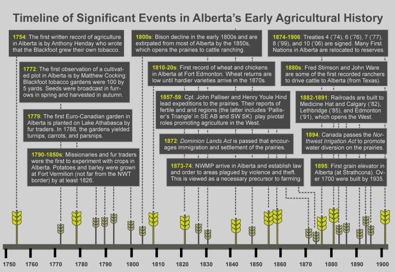 Over 200 million years of mountain uplift, sediment pouring, and mountain-driven climates followed by 10,000 years of grazing and burning produced the inviting grasslands that greeted Alberta’s early farmers. Blackfoot First Nations in Alberta farmed tobacco in small plots for at least several hundred years before the spread of grains (e.g., wheat, barley, oats) and cattle ranching in the 1800s. The figure below is a timeline of several events in Alberta that shaped the early spread of farming.