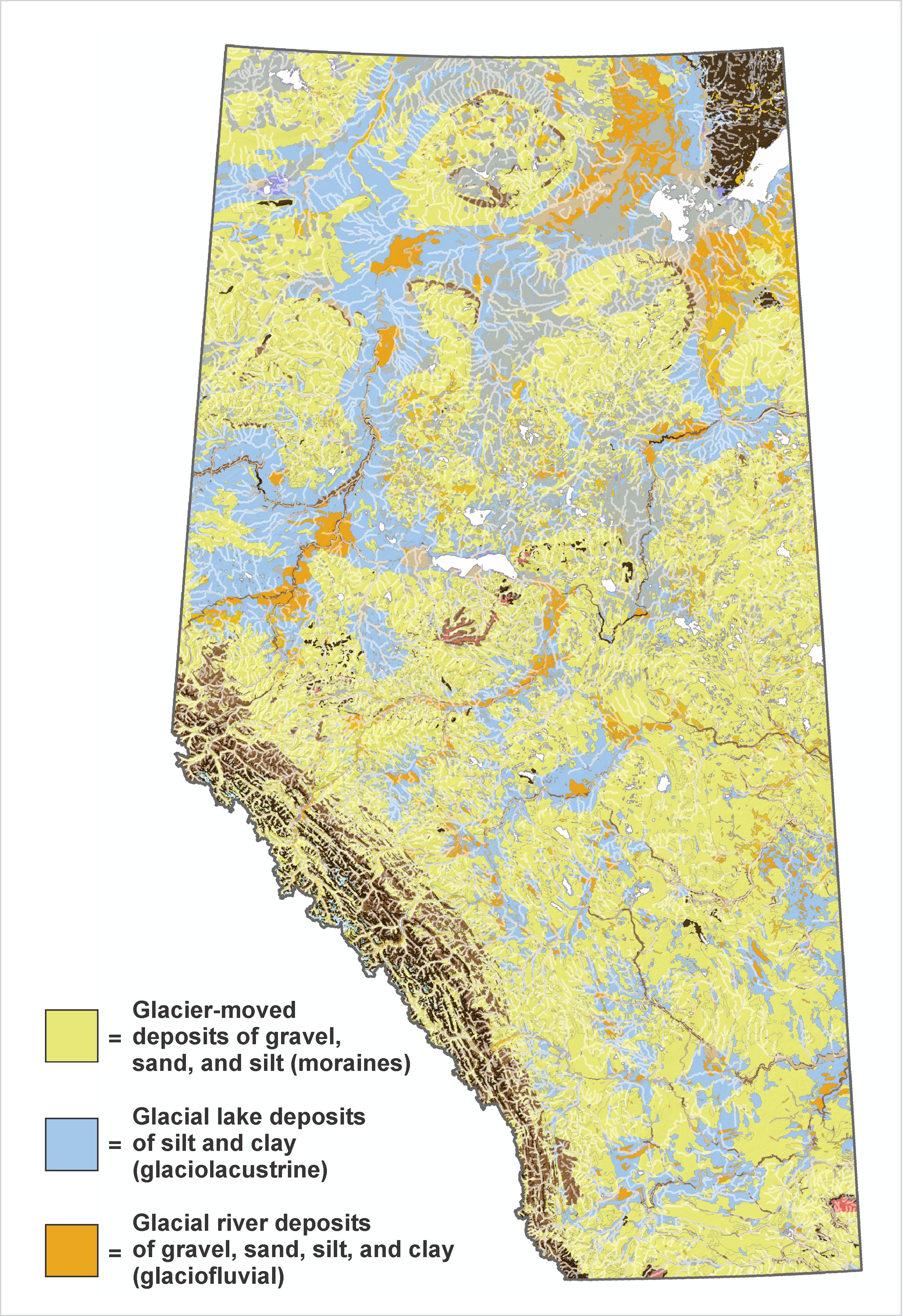For almost 200 million years, Alberta has been tilted: our bedrock is formed largely of shales and sandstones that built up when sediment either poured off the mountains and solidified into rock or settled down in ancient waters that once filled a basin over Alberta. From about 50 to 5 million years ago, huge sheets of gravel and sand continued to shed off the Rockies (carried by rivers and streams) before settling into our basement.