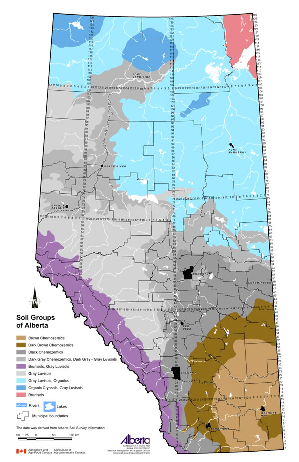 Because Alberta soils started forming around 10,000 years ago, they have not been leached (when water carries away minerals and nutrients) like other parts of the world. Our northern geography helps: water does not constantly pour through Alberta soils for the simple fact that it’s frozen much of the year. A sharp spike in spring melt, however, filters through our young soils and replenishes groundwater.