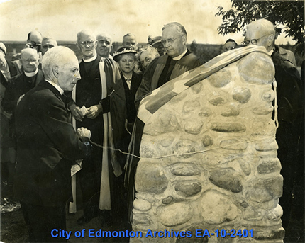 Unveiling of the Hermitage Cairn and Plaque, 1951. Rt. Rev. G.C. Hubback, Bishop of Burma, Walter Everard Edmonds of the City of Edmonton Archives and Landmarks Committee, et al. attending. City of Edmonton Archives EA-10-2401.