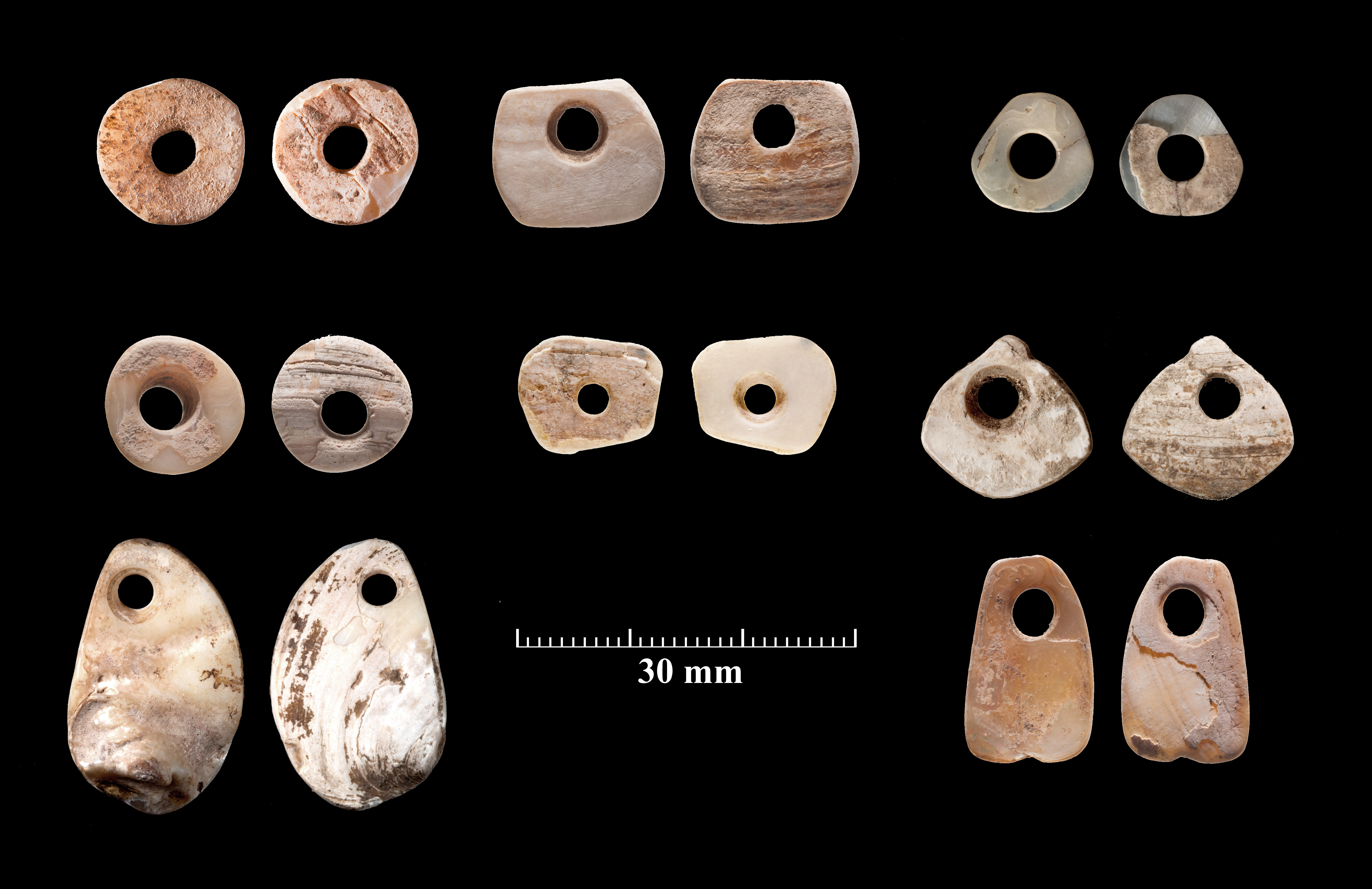 Most beads from Cluny Fortified village are disc beads (upper left), but a variety of other shapes have also been found. For each pair of beads, the left image is the inside shell surface and the right image is the outside shell surface.