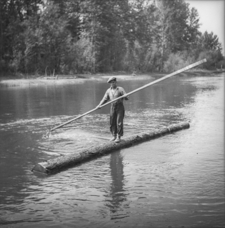 A man poling down Athabasca River between 1937-39 (from the Chisholm Sawmill and Freeman River Lumber Camp). Log drivers floated along with the timbers to dislodge jams and notify the mills when shipments were arriving by water. Image A3790 courtesy of the Provincial Archives of Alberta.A logging camp (the Jackpine Wood Camp on Little Slave River in 1909) with men and their tools. Image A2532 courtesy of the Provincial Archives of Alberta.