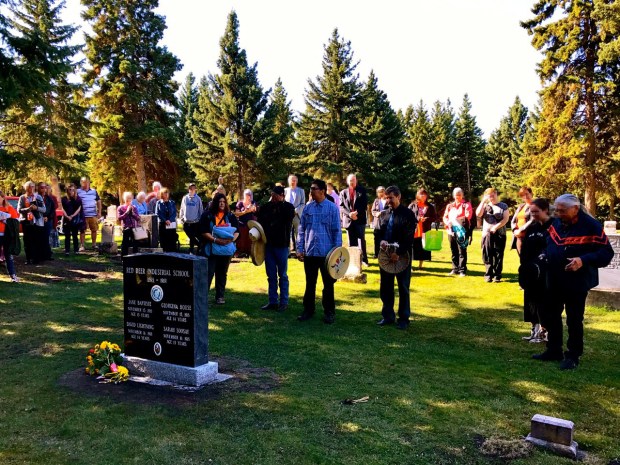 The Big Voice Drummers finish a victory song as a Red Deer City Cemetery monument is unveiled, honouring four children who died while attending Red Deer Industrial School (2017).
