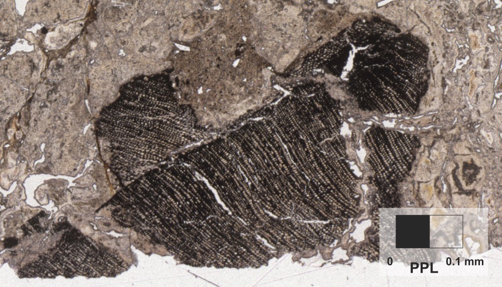 Grizzly Ridge Opal (GRO) is a toolstone that outcrops near Deer Mountain in north-central Alberta. An archaeological site complex was discovered in this area that contained a number of flakes and unworked pieces of the raw material. Research efforts are currently underway to characterize GRO but thin section analysis has played a large role in naming the material. GRO is a relatively distinct looking raw material with vitreous white and brown patches throughout. At first the rock was deemed to be a chert, which by definition is primarily composed of microcrystalline or cryptocrystalline quartz. Thin section analysis revealed that, in addition to quartz, the rock contains a significant amount of opal, which informs how the material originated. Interestingly, small pieces of petrified wood were also identified in some samples, which reveals the conditions and environments in which the material formed.