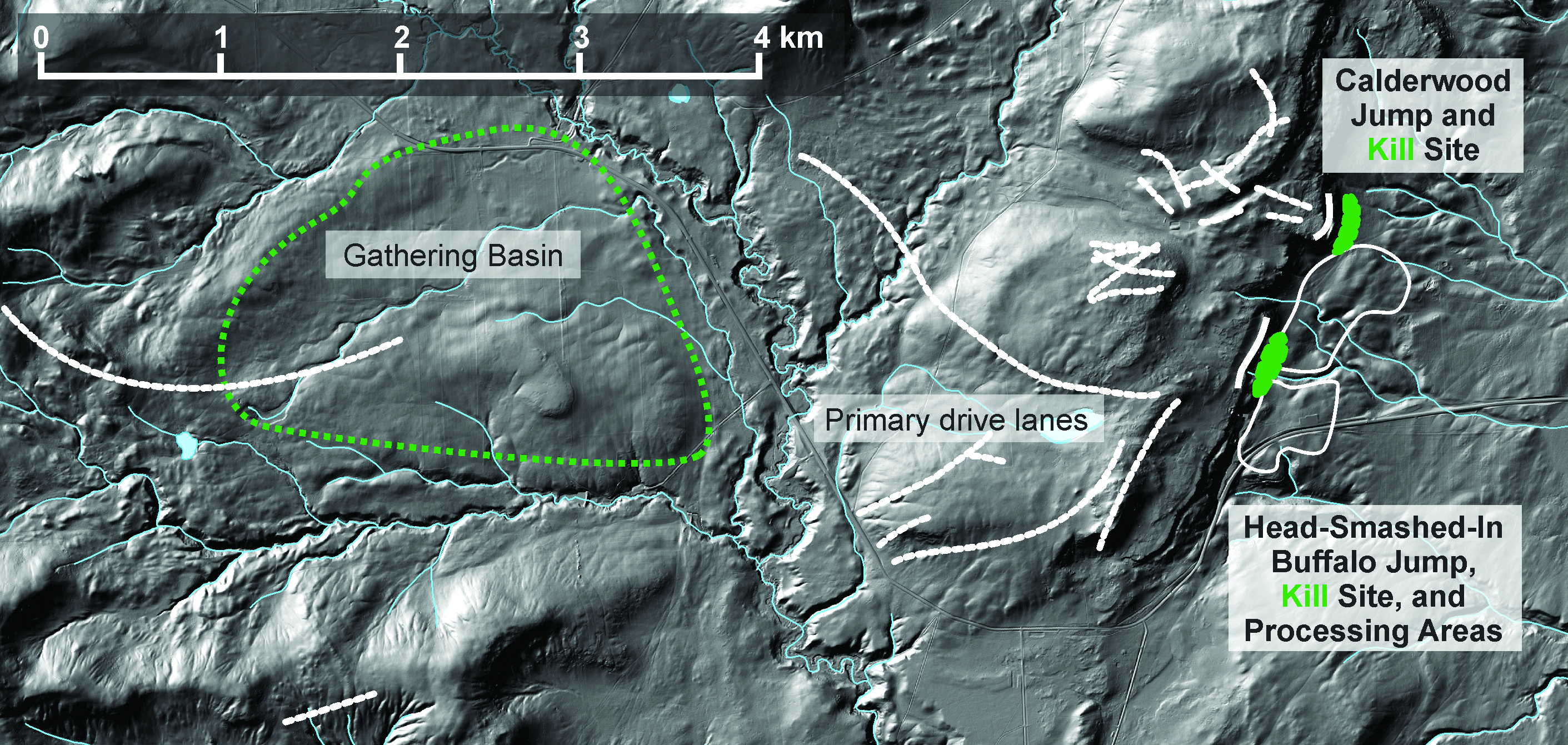 This image cultural landscape of Head-Smashed-In Buffalo Jump in the physical topography. Buffalo runners drew buffalo out of the gathering basin into drive lanes- valleys with lanes built up with piles of stones and brush. Once the bison were inside the lanes, people behind blinds drove the bison over cliffs that gave the illusion of continuing prairies. Courtesy of Todd Kristensen.