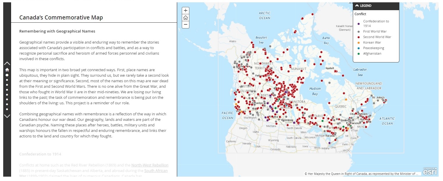 In 2018, the Geographical Names Board of Canada launched Canada’s Commemorative Map, an interactive, digital map that highlights places and features in Canada that were named to honour and commemorate Canada’s war heroes and casualties. Source: Geographical Names Board of Canada.