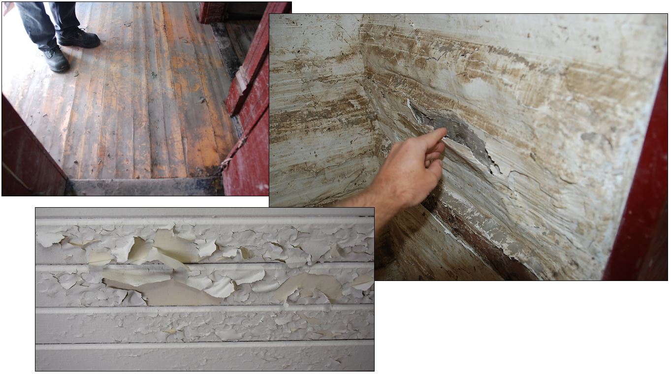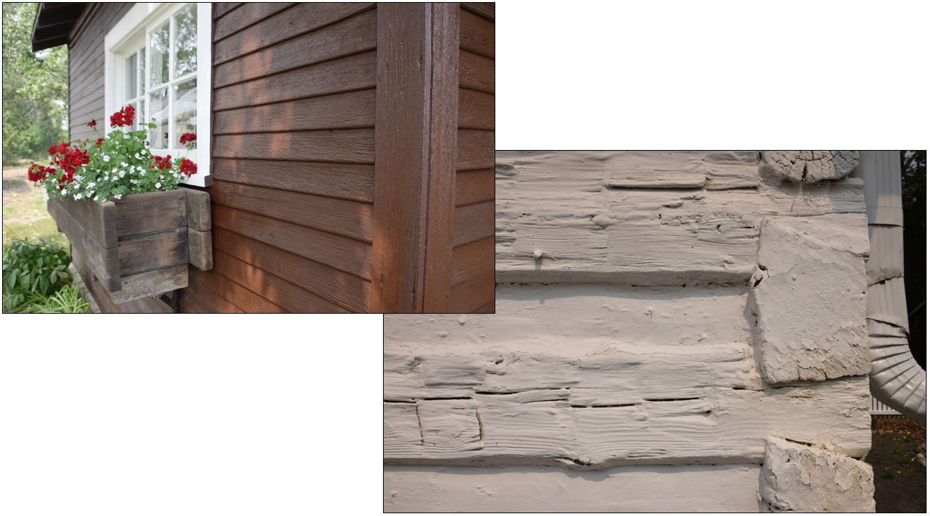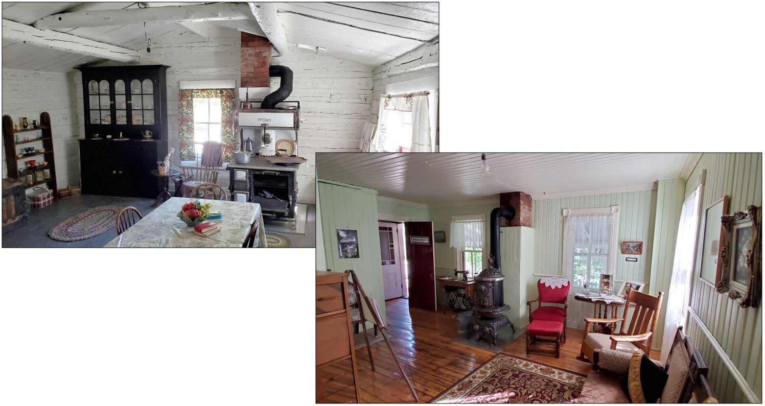 An undated historic photograph of the Sheppard/Maccoy House shows the log kitchen and larger 1920s frame addition with porch at left. The gabled front of the roof cellar is visible against the embankment at the far right background. Source: Museum of the Highwood.A glimpse through mud-streaked windows on July 3, 2013 revealed a chaotic scene of soaked furniture and heirlooms strewn throughout the interior by the flood. In the kitchen at right, tidelines of silt on the whitewashed log walls attest to the depth of flooding, July 23, 2013. Source: Historic Resources Management Branch.While some flood trauma is immediate and obvious, other impacts may emerge over weeks or months. Cupping of the front hall floor in August 2013 (upper left) resulted from the floor varnish that inhibited gradual, uniform drying of the saturated wood. In the kitchen (right), moisture in the logs pushes a thick shell of whitewash and paint from the walls. Condensation in the damp interior causes latex paint on the living room ceiling to peel from underlying oil-based paint until heat and other services are restored (lower left). Source: Historic Resources Management Branch.With funding in place, flood rehabilitation gets underway in earnest in 2016 with lifting of the house onto a new concrete foundation and a dry, well-drained and ventilated crawl space in 2016. Like many early log structures, the kitchen rested directly on the ground, where damp soil is susceptible to frost heave and leads to rot, subsidence and distress of the structures above. Wet, silty flood deposits aggravated these problems. Though costly, a new foundation safeguards the historic buildings for generations to come. Even with this major structural upgrade, important historic features like the worn wood kitchen door threshold were preserved (bottom). Source: Historic Resources Management Branch.Views of the 1920s tongue-and-groove interior in July and December 2013 show drastic post-flood interventions needed for thorough cleaning and drying of the structure. The historic living room was stripped to clean and disinfect the wall cavities after contractors carefully numbered and removed the interior trim and individual wall boards for drying and reinstallation. Finish flooring was also removed to aid drying and hopefully relieve cupping of the finish floor. The interior was unrecognizable from its pre-flood state and restoration seemed a daunting, even impossible, undertaking. Source: Historic Resources Management Branch.The exteriors were less severely impacted by the flood but benefitted as well from conservation. Varied exterior materials include painted clapboard at the house, garage, shed and guest house; whitewashed logs of the original cabin (kitchen); and limewashed plaster at the root cellar. Traditional whitewash was reapplied to the log cabin using a mixture of high-calcium lime, water and natural additives like milk powder or glue flakes. This both protects the logs and actively draws moisture from the wood due to lime’s intrinsic capillary properties. Linseed oil paint was applied to the clapboard exteriors, a traditional treatment that is highly flexible, breathable and ideal for protecting weathered wood like the guest house exterior. The oil penetrates and reconditions the wood and prevents the cyclical shrinkage and swelling that leads to cracking and premature paint failure. Source: Historic Resources Management Branch.Historic paint colours were documented before the interior was repainted. A simple, practical method uses fine sandpaper to expose previous paint layers that are matched to a current colour standard – in this case, to swatches of a major paint manufacturer. The living room walls revealed varnished fir boards that were later painted pale blue, yellow, pale green and most recently, white. Colour records were added to the project conservation report. The full range of colours is historic but pale green was chosen to reflect the living room as last painted by Ruth Maccoy. The repainted interior retains the underlying older colours as part of the building’s history. However, drying of the wood structure continued even into 2018 and ongoing shrinkage and movement of the tongue-and-groove interior meant that the final coat of paint had to wait until the woodwork was finally stable. Source: Historic Resources Management Branch.A dream come true, the log kitchen and living room look once again as they did historically in September 2020 with Ruth Maccoy’s stove, furniture and other artifacts painstakingly restored by the Sheppard Family Park Society (compare with the second and fifth photos above). Source: Historic Resources Management Branch.The restored Maccoy Homestead faces south over the garden, with the shed and root cellar visible behind the house and the guest house at far right. Source: Historic Resources Management Branch.