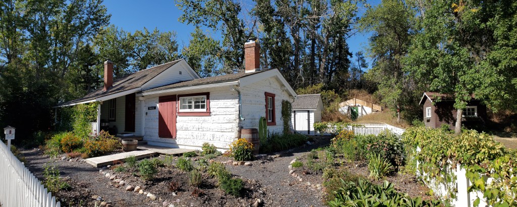 The home is a charming 1883 whitewashed log building, the earliest structure on the site, with a frame addition and porch built by her parents in the 1920s and surrounded by a garden and picket fence lovingly tended by Ruth Maccoy over the years. Behind the house are a garden shed, a small guesthouse, and a root cellar set into an embankment, while the garage is located nearby. A path leads west through the trees to a footbridge over the Little Bow River, usually a shallow creek, to the historic water source in a natural spring.
