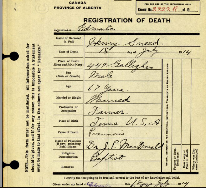 If a person was born, married or died in Alberta, there is usually (but not always) a registration of that event within the province’s vital statistics records. Although the details they capture vary over time, the registrations provide invaluable evidence of locations of births, the parent’s names of brides and grooms and burial locations. The PAA’s holdings include birth records that are 120 years or older (from the date of birth), marriage records that are 75 years or older (from the date of marriage), death records that are 50 years or older (from the date of death), and stillbirth records that are 75 years or older (from the date of stillbirth). The records available at PAA would likely capture the birth of children of the earliest settlers, their marriages, and the deaths of those early settlers. Although his registration provides limited detail, it records that Henry Sneed, the man who first scouted Amber Valley and returned with settlers, died in Edmonton in 1914.