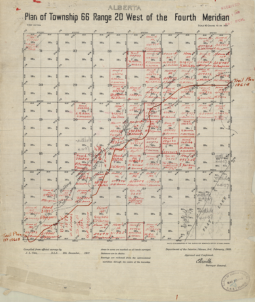 The federal Dominion Lands Act of 1872 allowed individuals to apply for a quarter section (160 acres) of land. After they had occupied the land for three years and made certain improvements, they could apply for the title to that land. The township maps and files resulting from the homesteading process are among the most used records at the Provincial Archives for a variety of purposes, including genealogy and the history of particular parcels of land. The files contain numerous references to the land taken up by Alberta’s Black settlers, including John Ware in Southern Alberta in the 1890s as well as the settlers of Amber Valley north of Edmonton in the early twentieth century. Using the name index created by the Alberta Genealogical Society, researchers can locate the microfilm reel and file numbers for specific settlers to learn about their experiences. While some files may be thin, they typically contain information about a settler’s origin as well as the state of the homestead at specific points in the homesteading process.