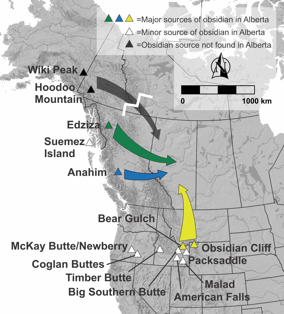 Maps of obsidian occurrences are also revealing contact zones between different people. The four most common obsidians in Alberta are from Bear Gulch (Idaho), Obsidian Cliffs (Wyoming), Edziza (northwest BC) and Anahim (west central BC). Edziza obsidian outcrops in the heart of Indigenous people called Dene, who historically occupied the forested regions of northern Canada. On the other end, Obsidian Cliffs and Bear Gulch obsidian is within the sphere of influence of Plains people like the Blackfoot. By mapping the extent of each obsidian, archaeologists can track movement and contact zones (or avoidance zones) of different groups of people.
