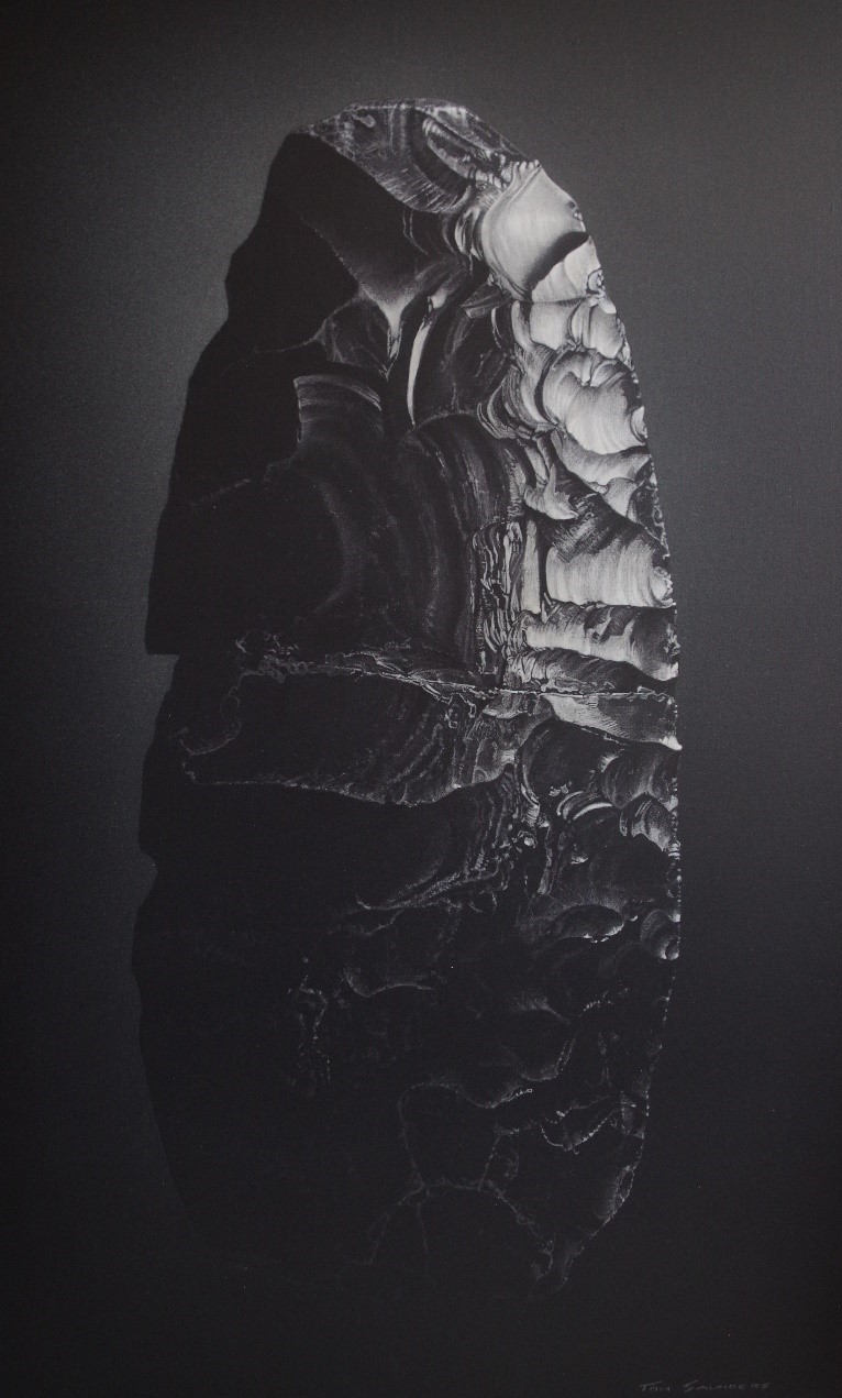 Pictured below is an acrylic and charcoal study of an obsidian artifact by Edmonton-area artist Tom Saunders that captures the lustre and beauty of a raw material valued by people for over 10,000 years. This artifact was found in 1937 just east of Edmonton and was recently matched to obsidian from Mount Edziza, almost 1,800 km away in BC. The Heritage Art Series is a shared project of the Historic Resources Management Branch, the University of Alberta and the Royal Alberta Museum: each artwork tells an important story about the people of our province. We hope it fosters a greater awareness of our past and instils a deeper respect for it.